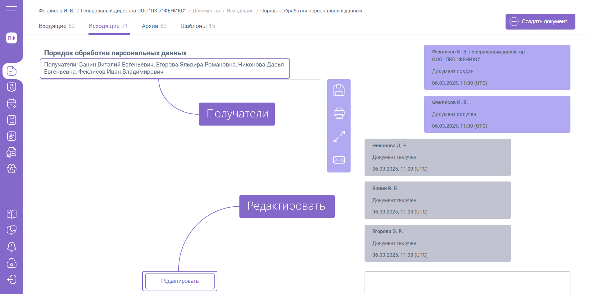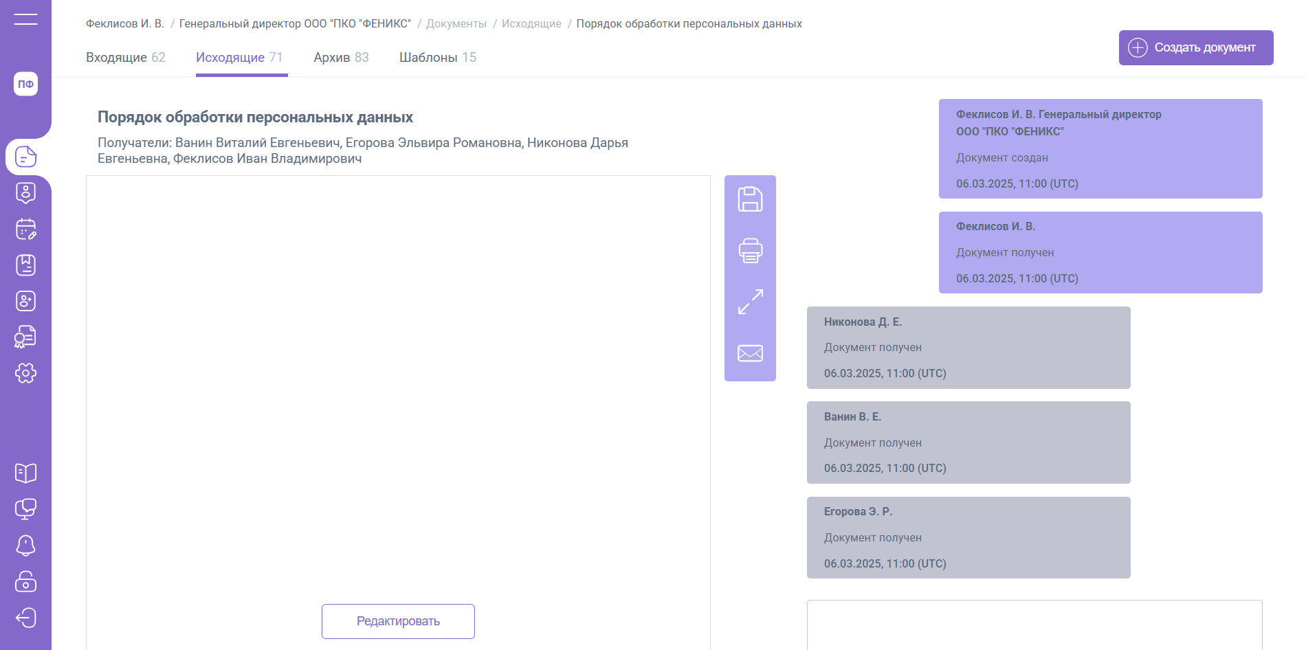 К документам, сформированным по маршруту «... входящий» будет доступна кнопка «Редактировать», с помощью которой возможно изменить наименование документа или сам документ.
