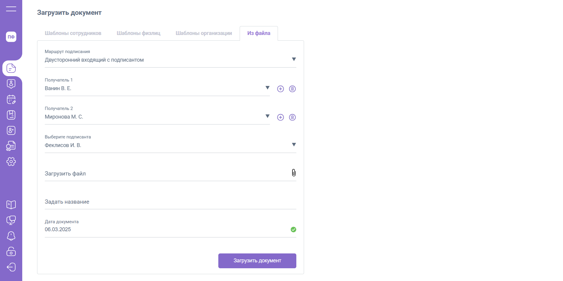 Для отправки документа «Из файла» выполните следующие действия: