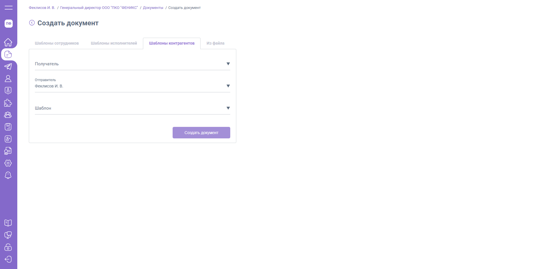 На вкладке «Шаблоны контрагентов» вы можете отправить любому контрагенту (ЮЛ / ИП) документ, созданный по финансовым шаблонам EasyDocs или служебному шаблону вашей компании.