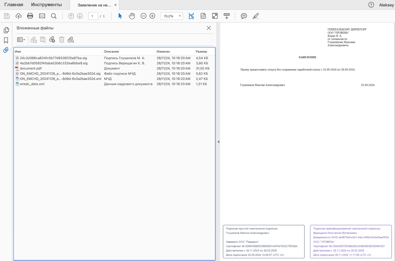 - Оригинал подписанного документа с названием Document.pdf. Именно этот файл подписан электронной подписью. Этот файл нужно использовать для проверки подписи.