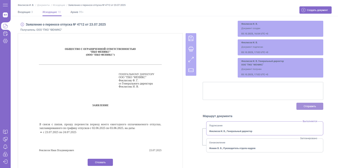 Отзыв документа, который уже был подписан доступен в папке «Исходящие».