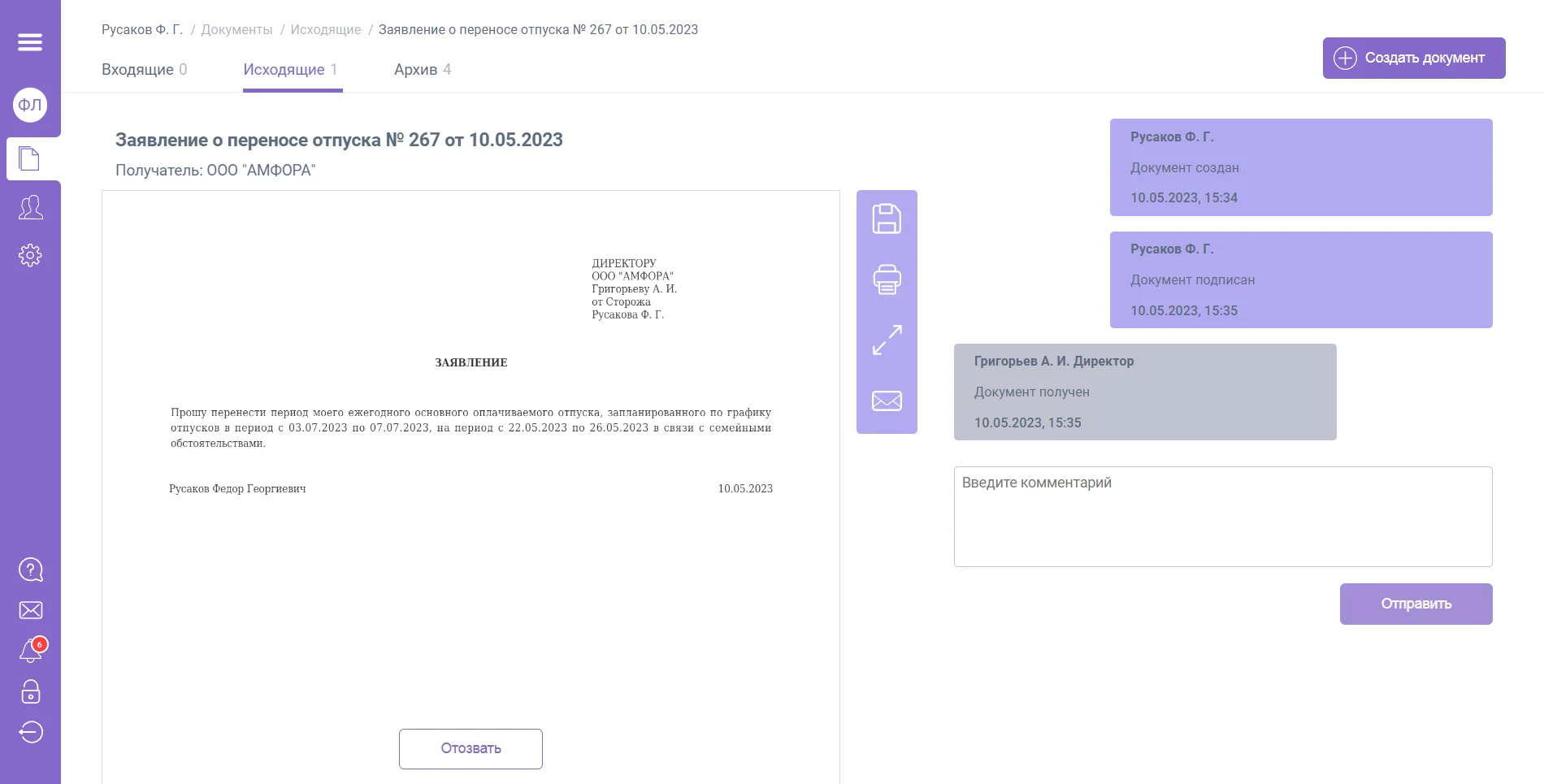 После отзыва документ будет перенесен в папку «Архив».