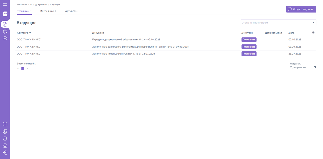 1. «Входящие» – содержит список документов, которые требуют действий с вашей стороны (подписание / ознакомление)