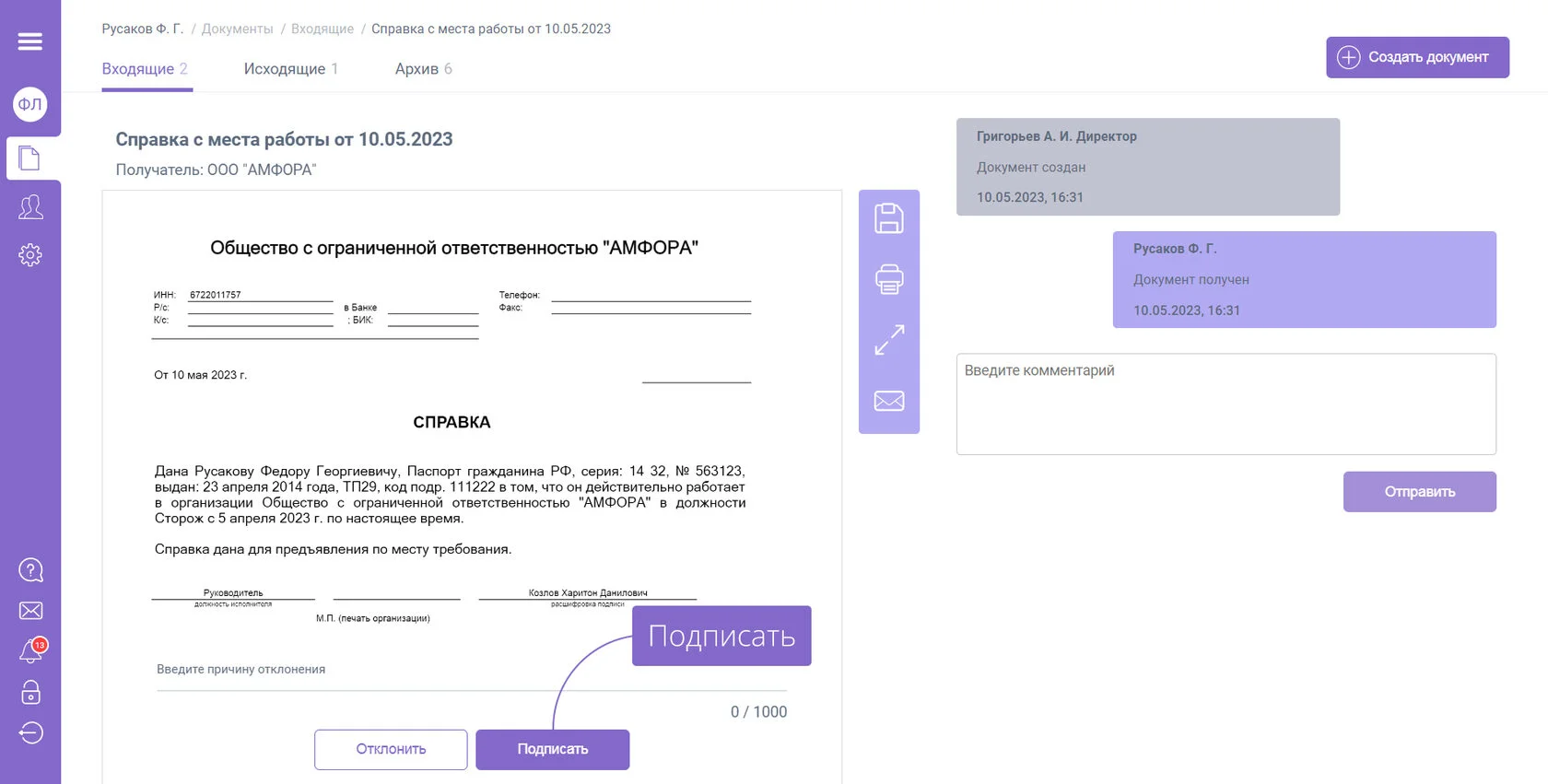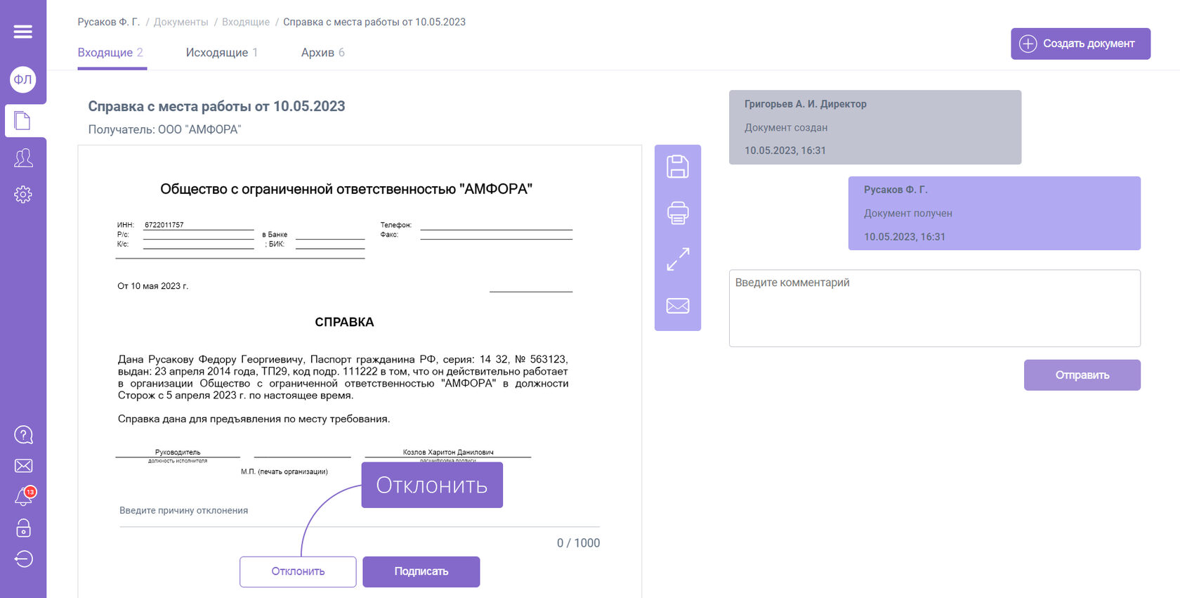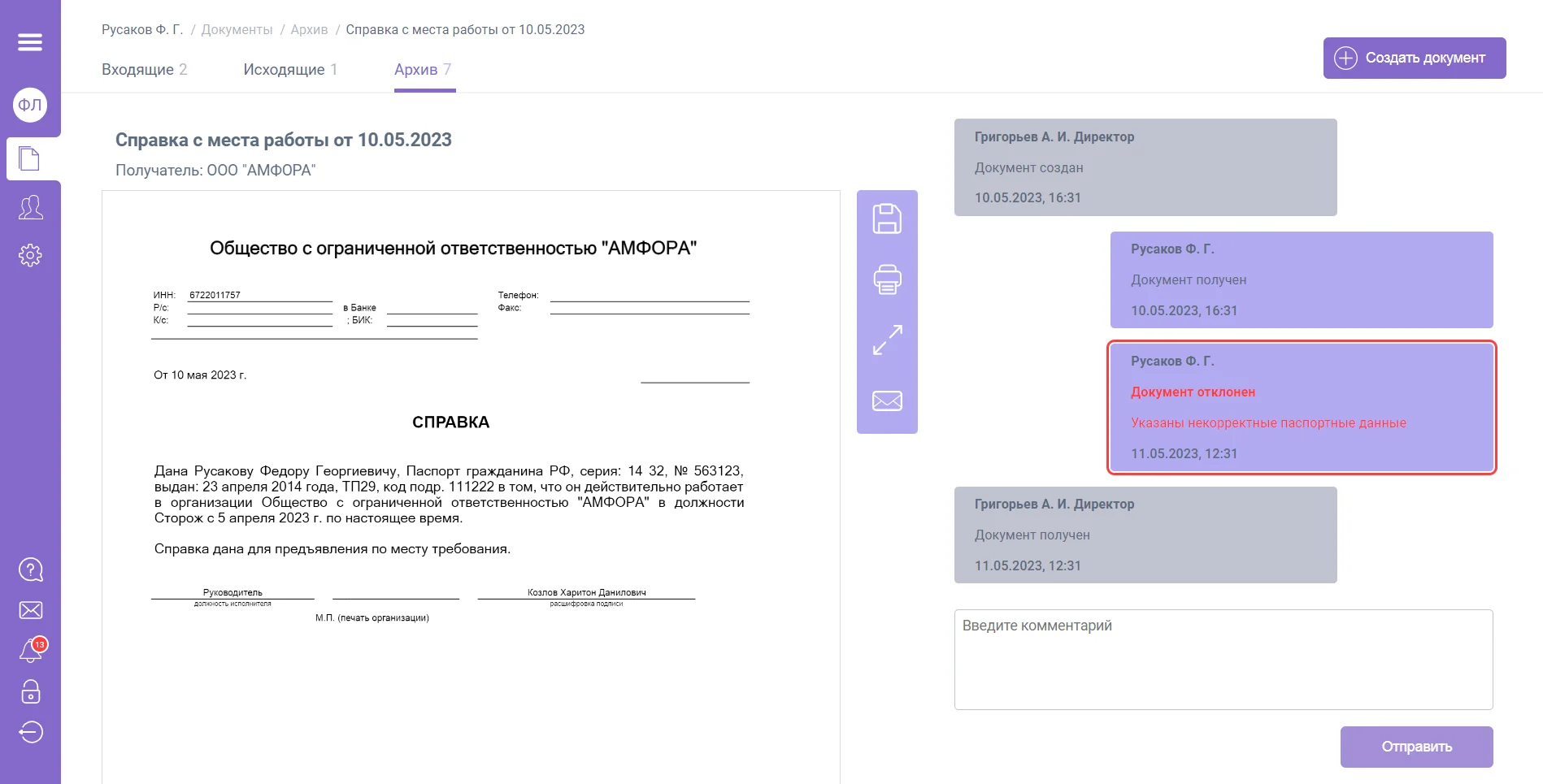 Документ перенесется в папку «Архив», в комментариях будет отображена причина отклонения.