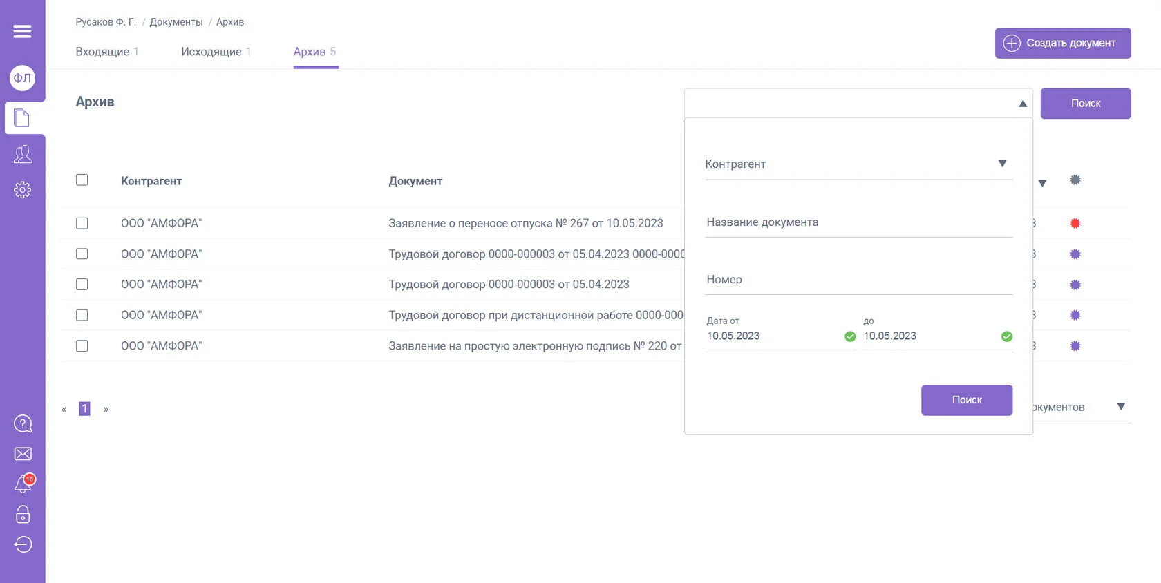 После заполнения данных выполните «Поиск» документов по заданным параметрам.