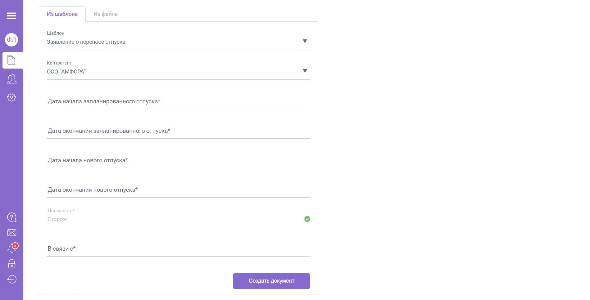 Выберите шаблон документа, который Вы хотите отправить, заполните все обязательные поля и нажмите кнопку «Создать документ».