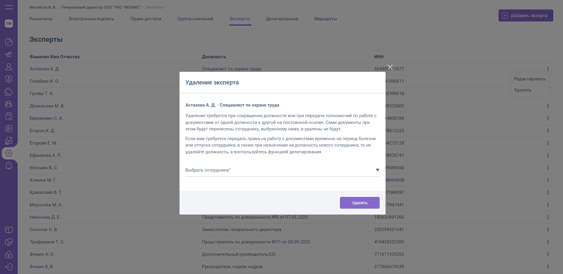 При выборе действия «Удалить» будет открыта форма выбора должностного лица для переноса документов из роли удаляемого Эксперта.