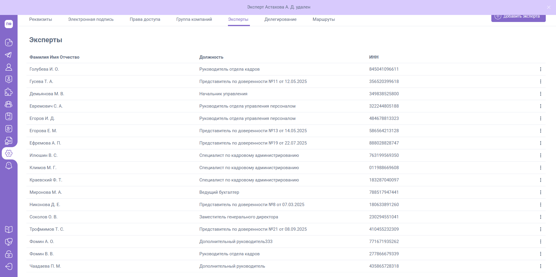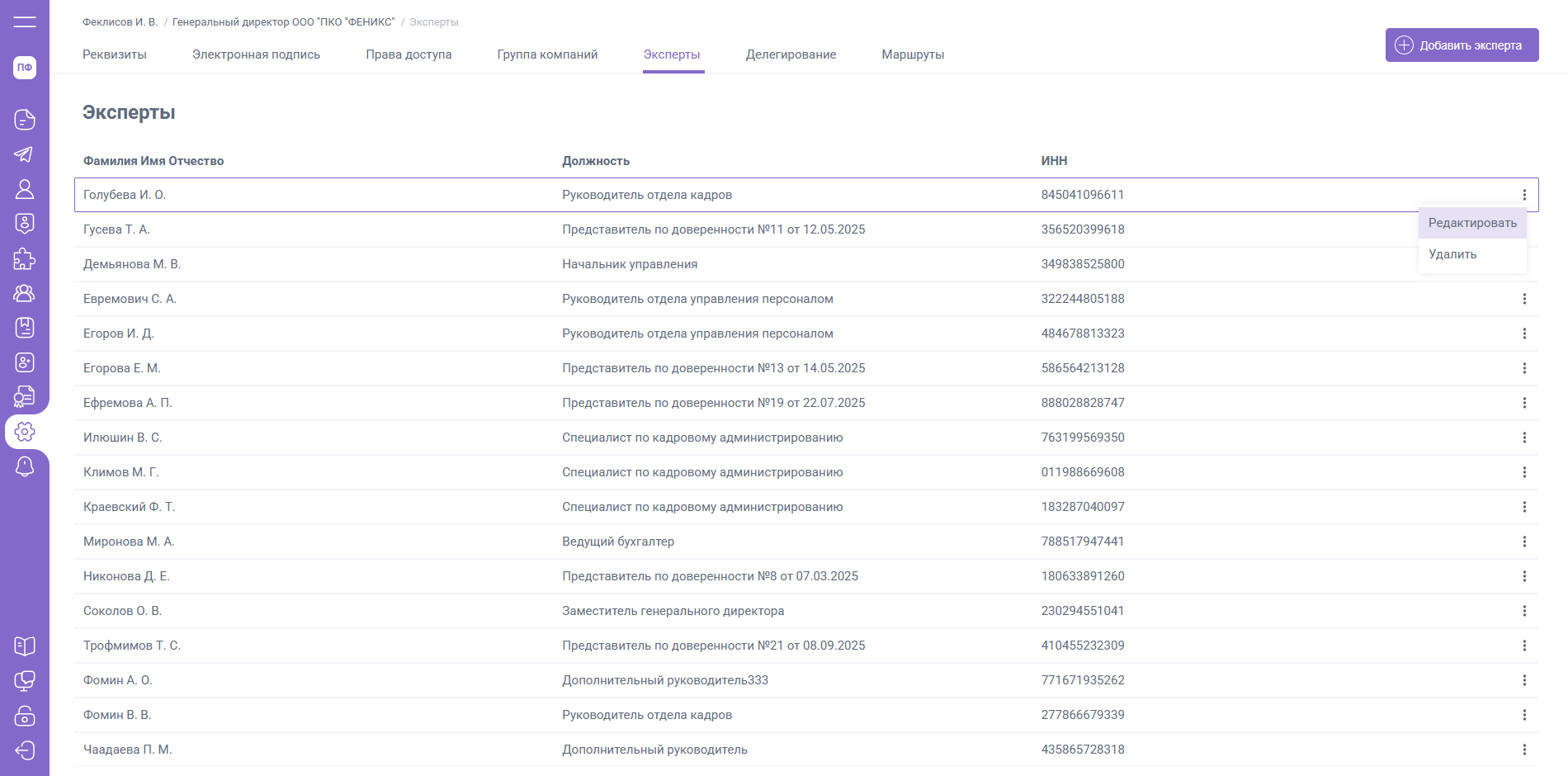 Должность добавленного Эксперта будет равна типу занятости пользователя (сотрудник, физлицо и т.д). Вы можете внести изменения в должность Эксперта выбрав в меню «Действия» пункт «Редактировать».