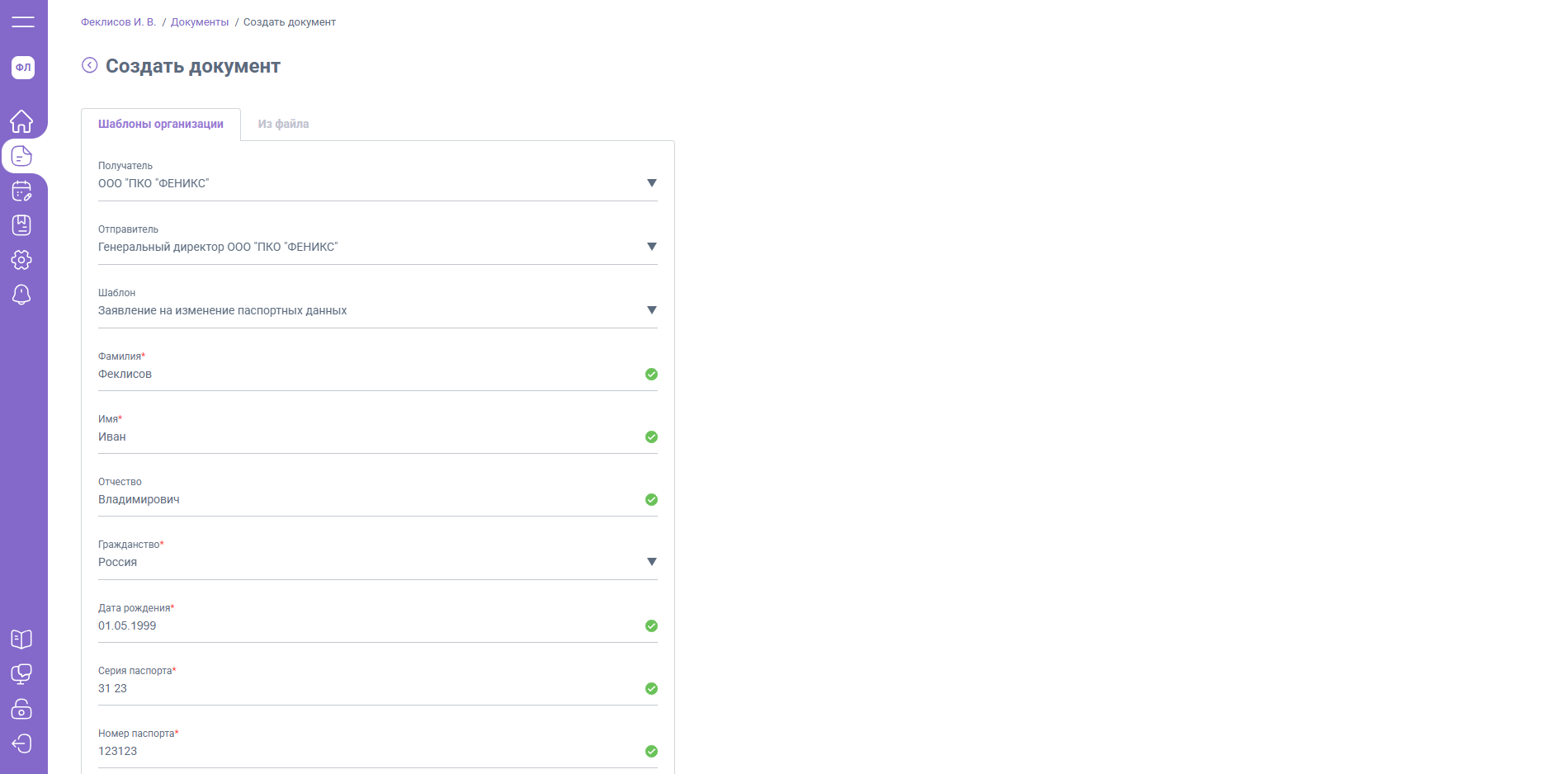 При создании документа, поля формы заполняются автоматически по текущим реквизитам роли физического лица.
