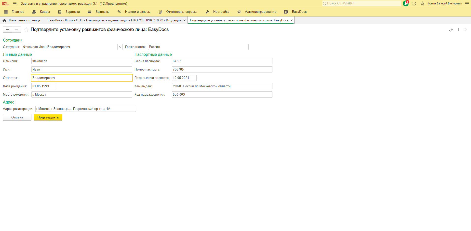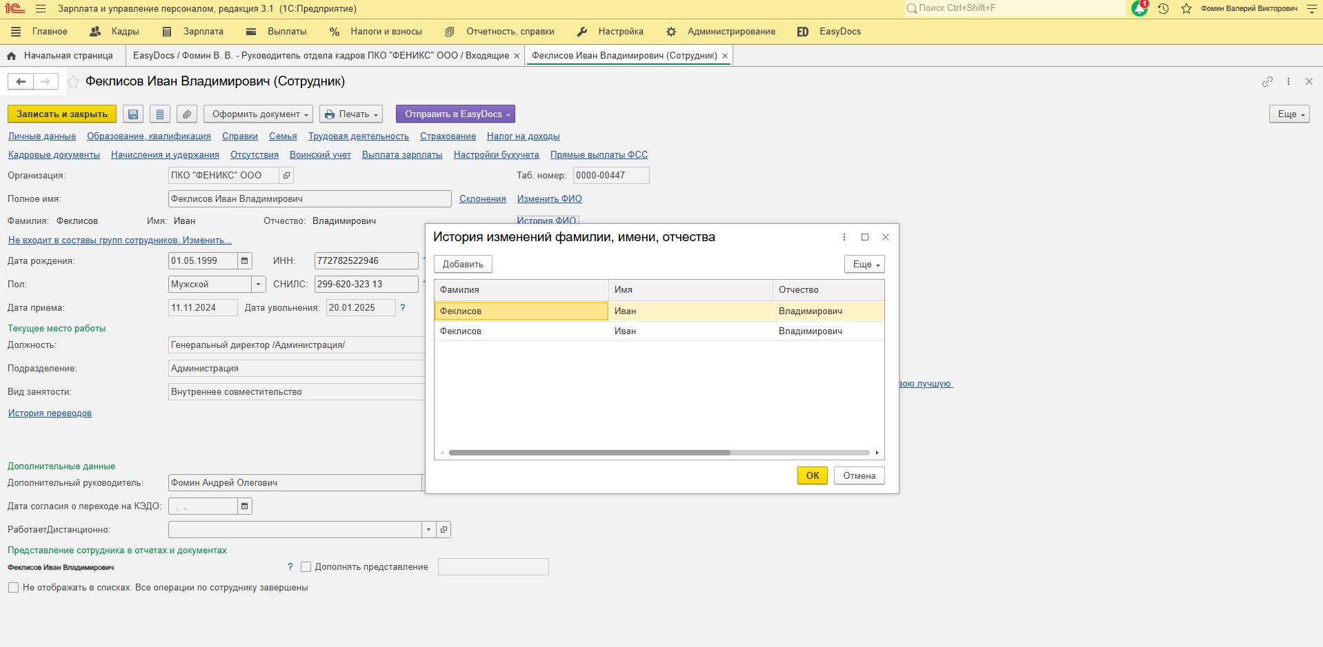 Изменение данных о ФИО в карточке сотрудника 1С.
