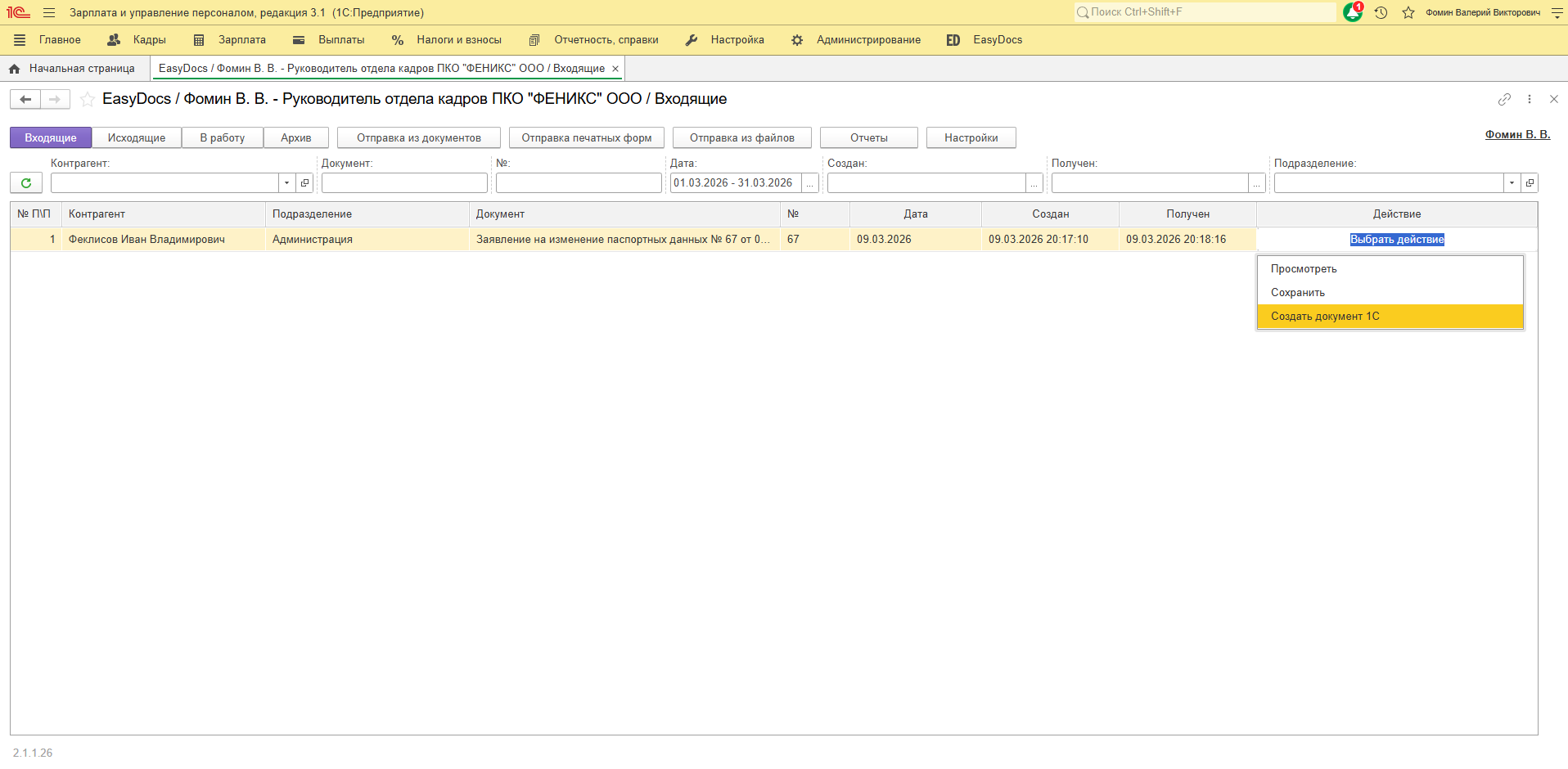 Ответственный за ознакомление получит документ в папку "Входящие" с действием "Создать документ 1С".