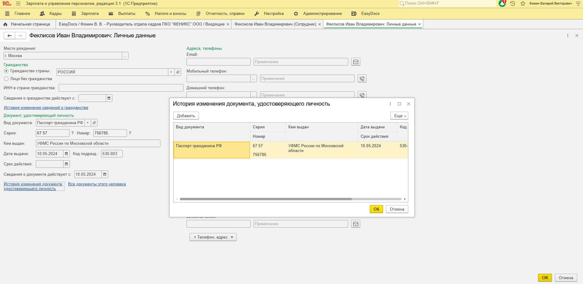 История изменения паспортных данных отобразится в "Личные данные" карточки сотрудника 1С.