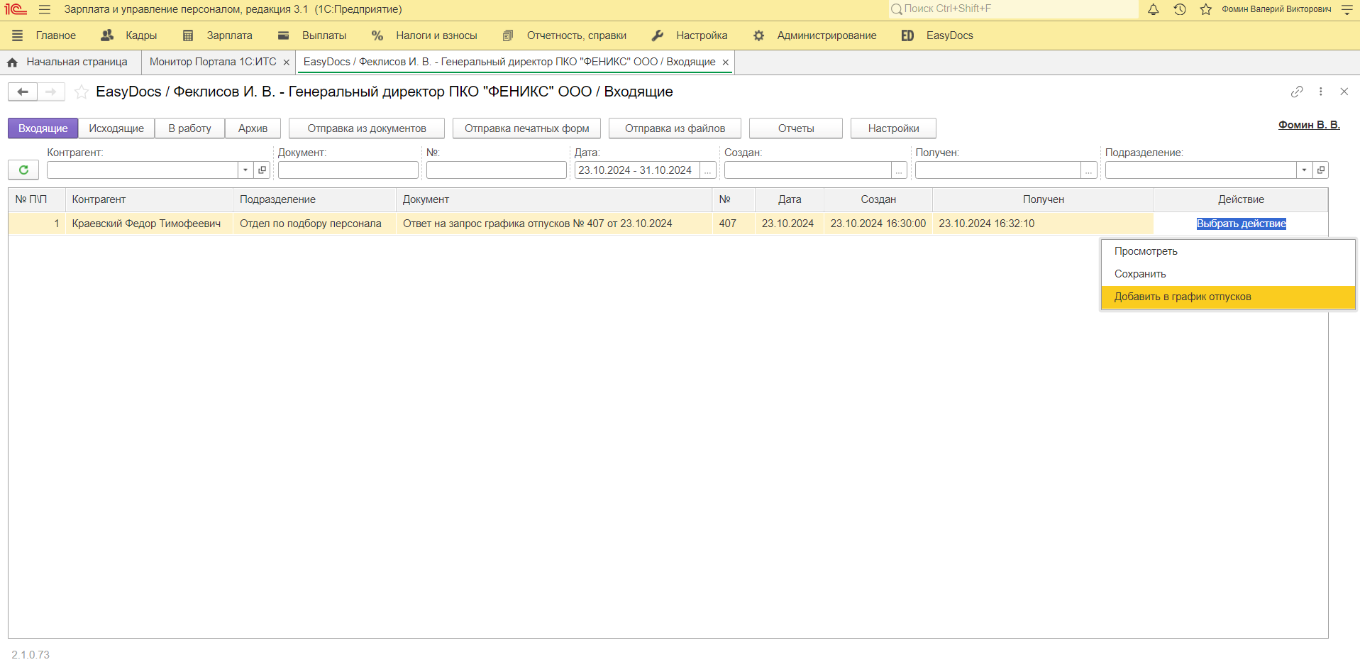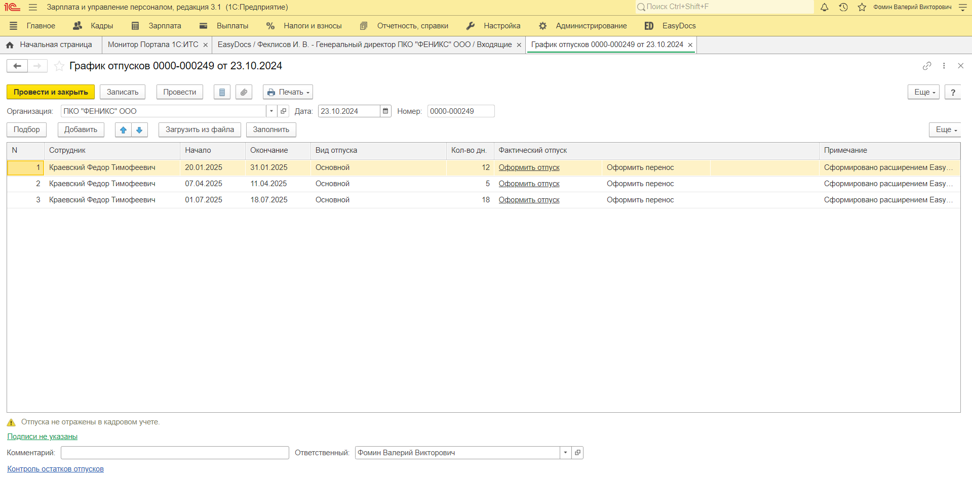 После подписания документ попадает специалисту кадровой службы в расширение EasyDocs, где он может ознакомиться с периодами отпусков сотрудника и добавить их в график, нажав «Добавить в график отпусков».