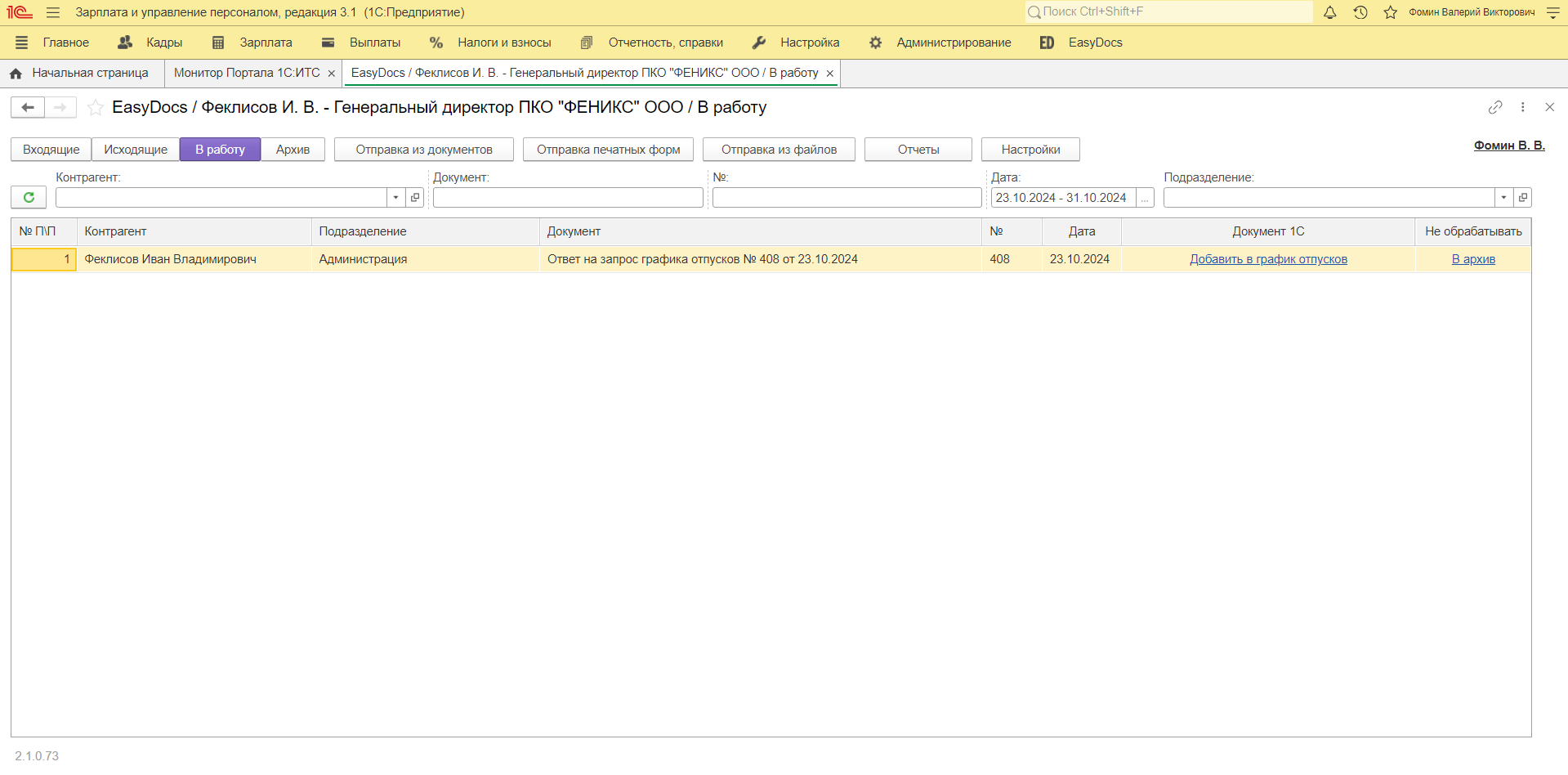 В том случае, если в маршруте, по которому проследовал документ, не указаны ответственные за ознакомление, документ будет доступен в папке «В работу». К ответу на запрос графика отпусков доступны действия по добавлению периодов в график отпусков или по переносу ответа в архив.