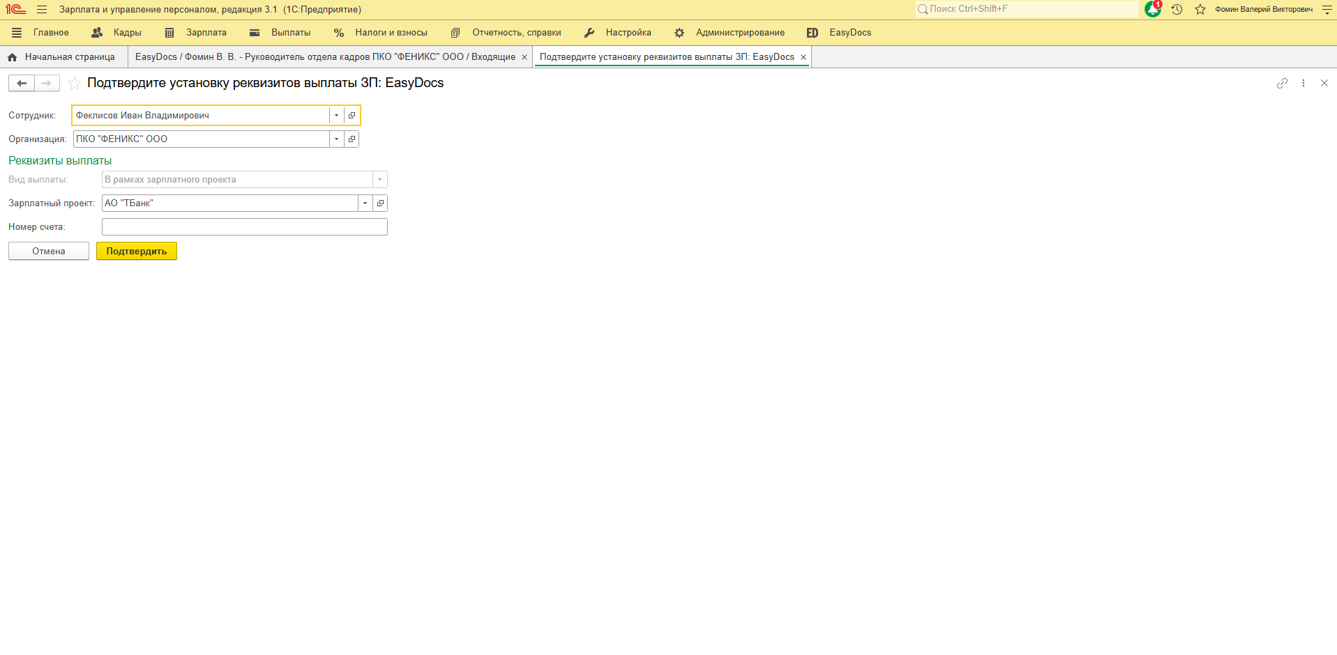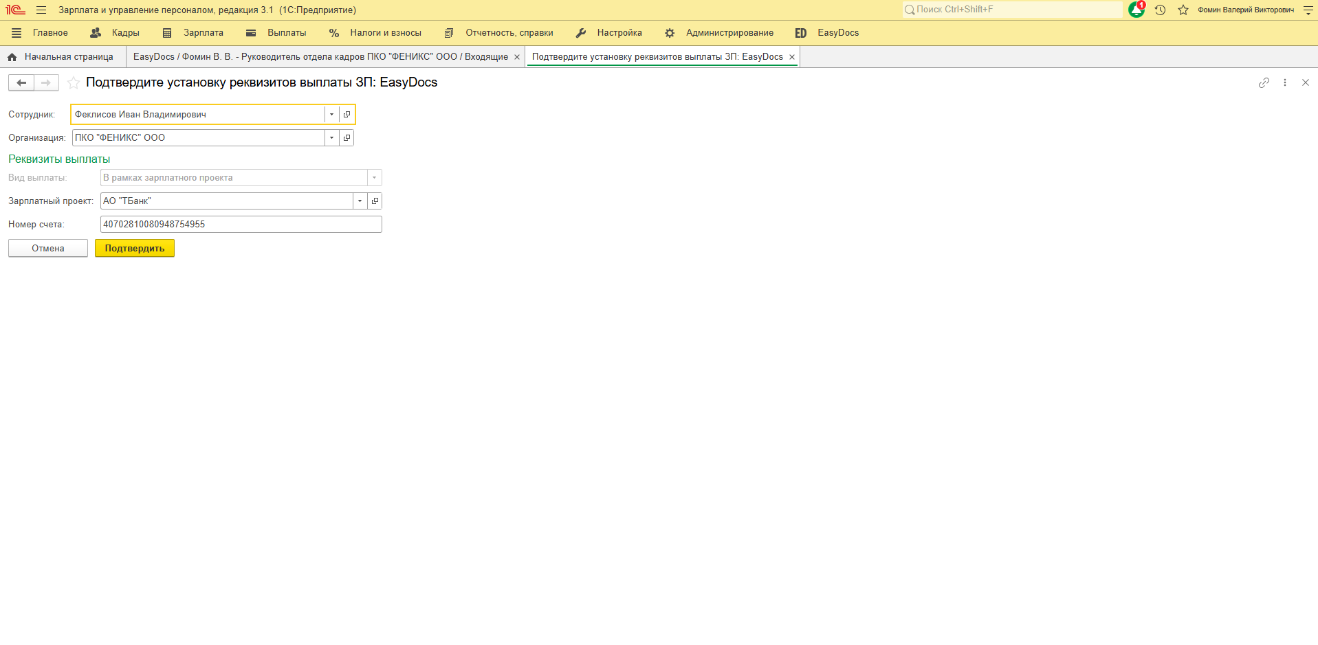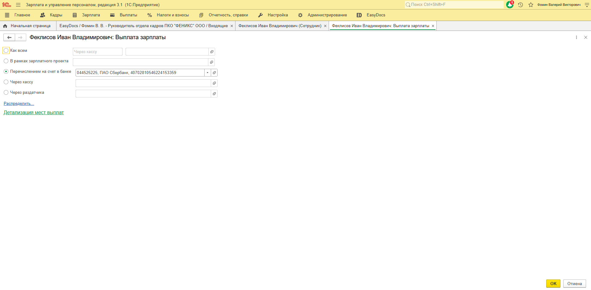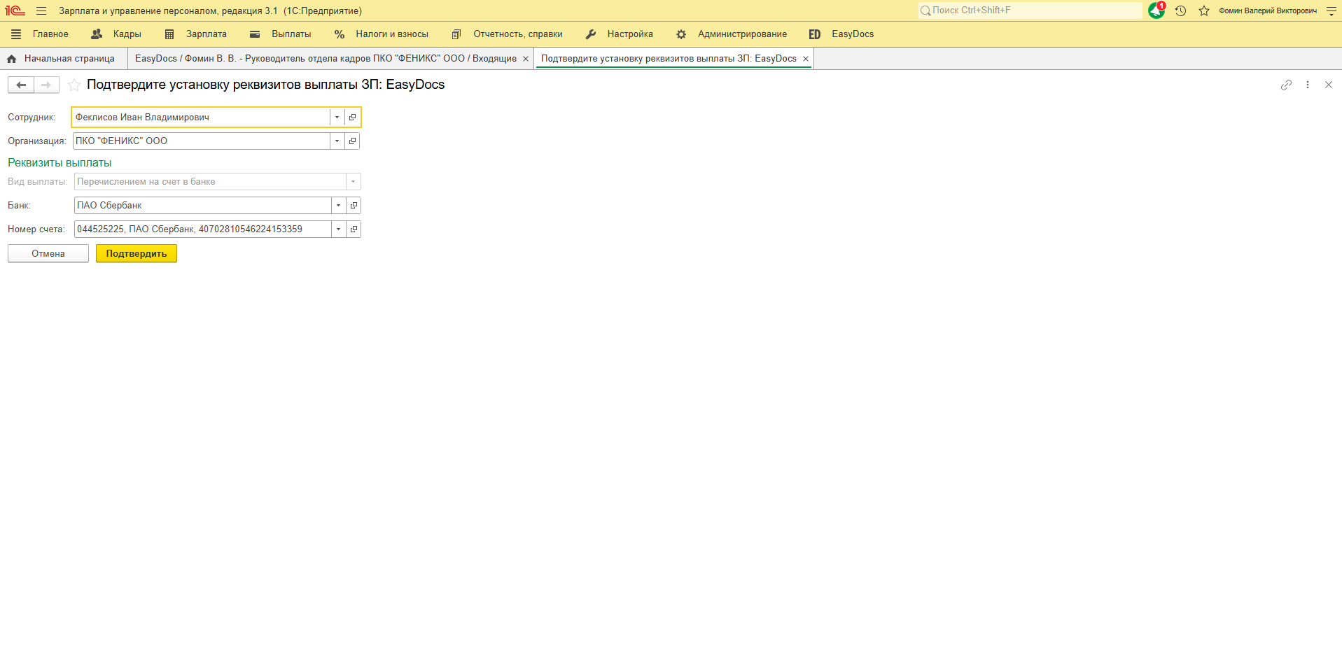 После подтверждения изменений - данные обновятся в карточке сотрудника 1С на вкладке "Выплата зарплаты".