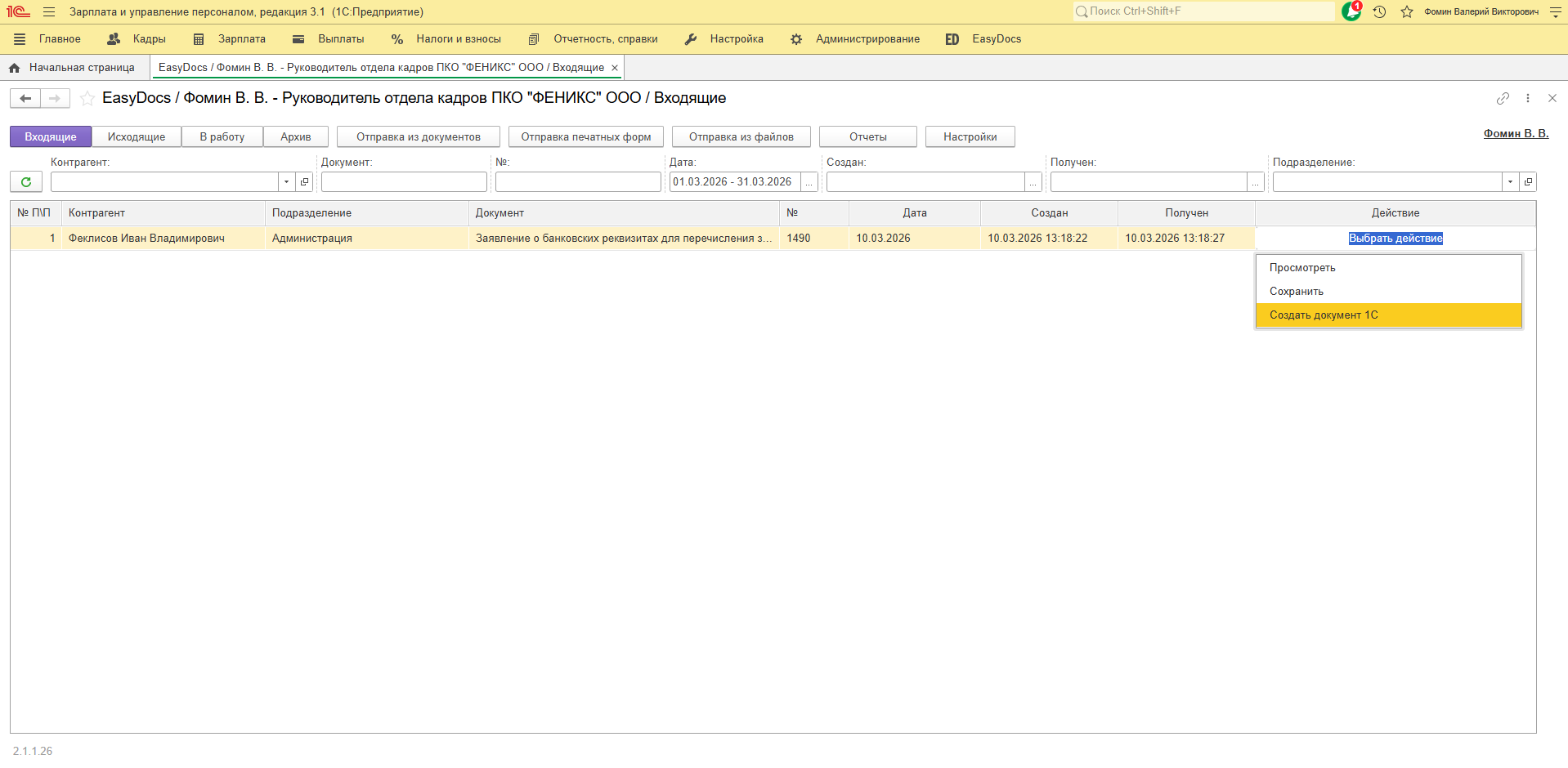Ответственному за ознакомление поступит документ в папку "Входящие" с действием "Создать документ 1С".