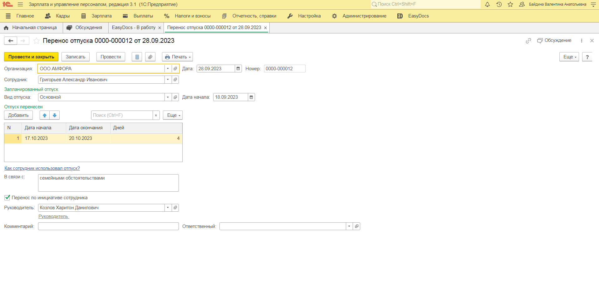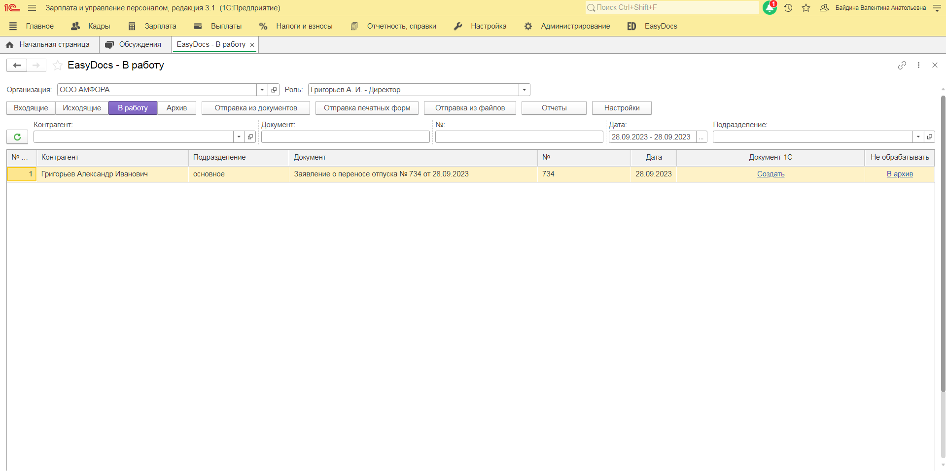 Заявление о переносе отпуска, которое завершило свой маршрут документооборота, будет доступно в папке «В работу». Нажав кнопку «Создать», Вы перейдете к этапу создания и обработки документа 1С - «Перенос отпуска».