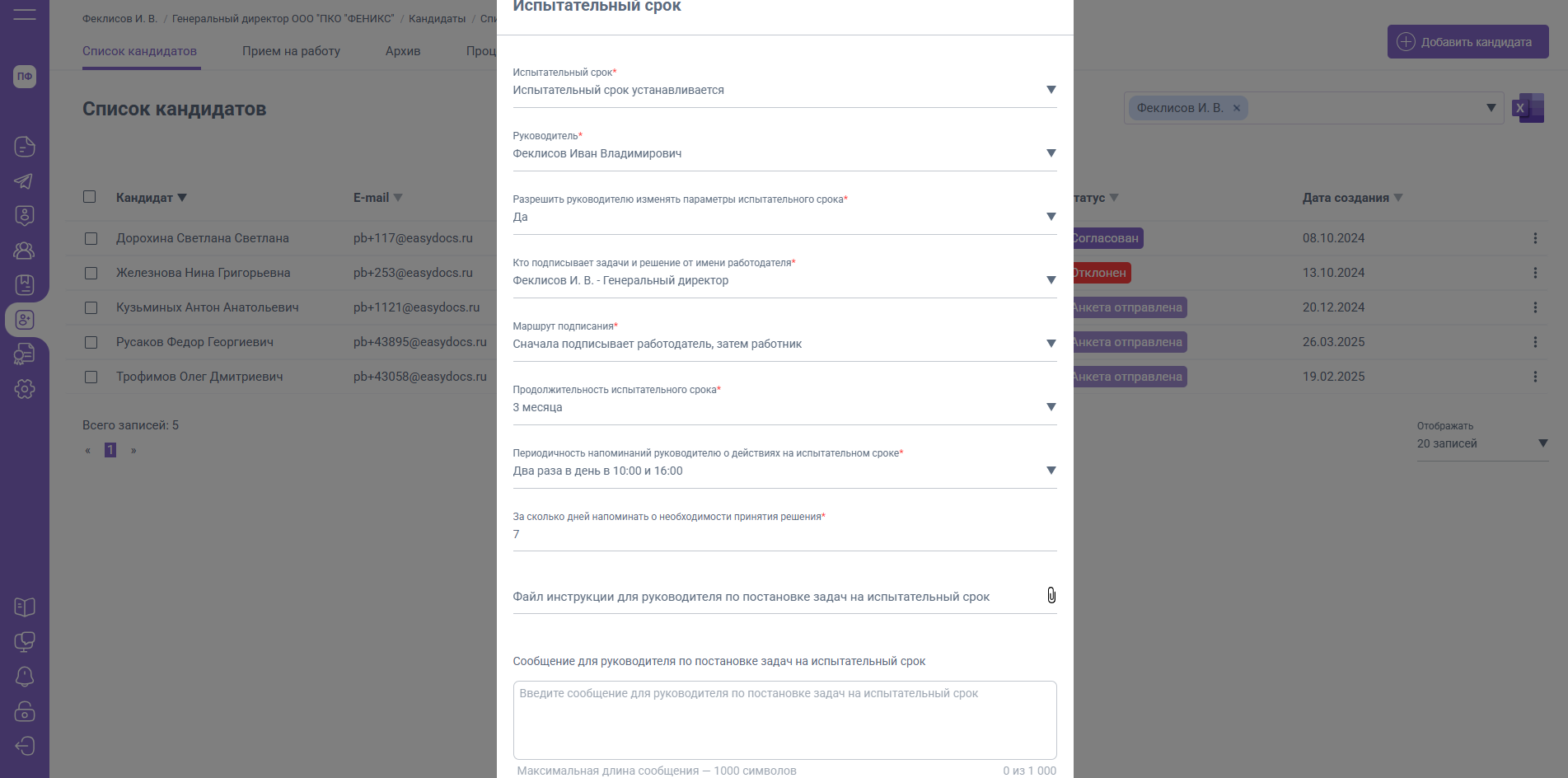 - Испытательный срок (устанавливается или не устанавливается для выбранного кандидата)