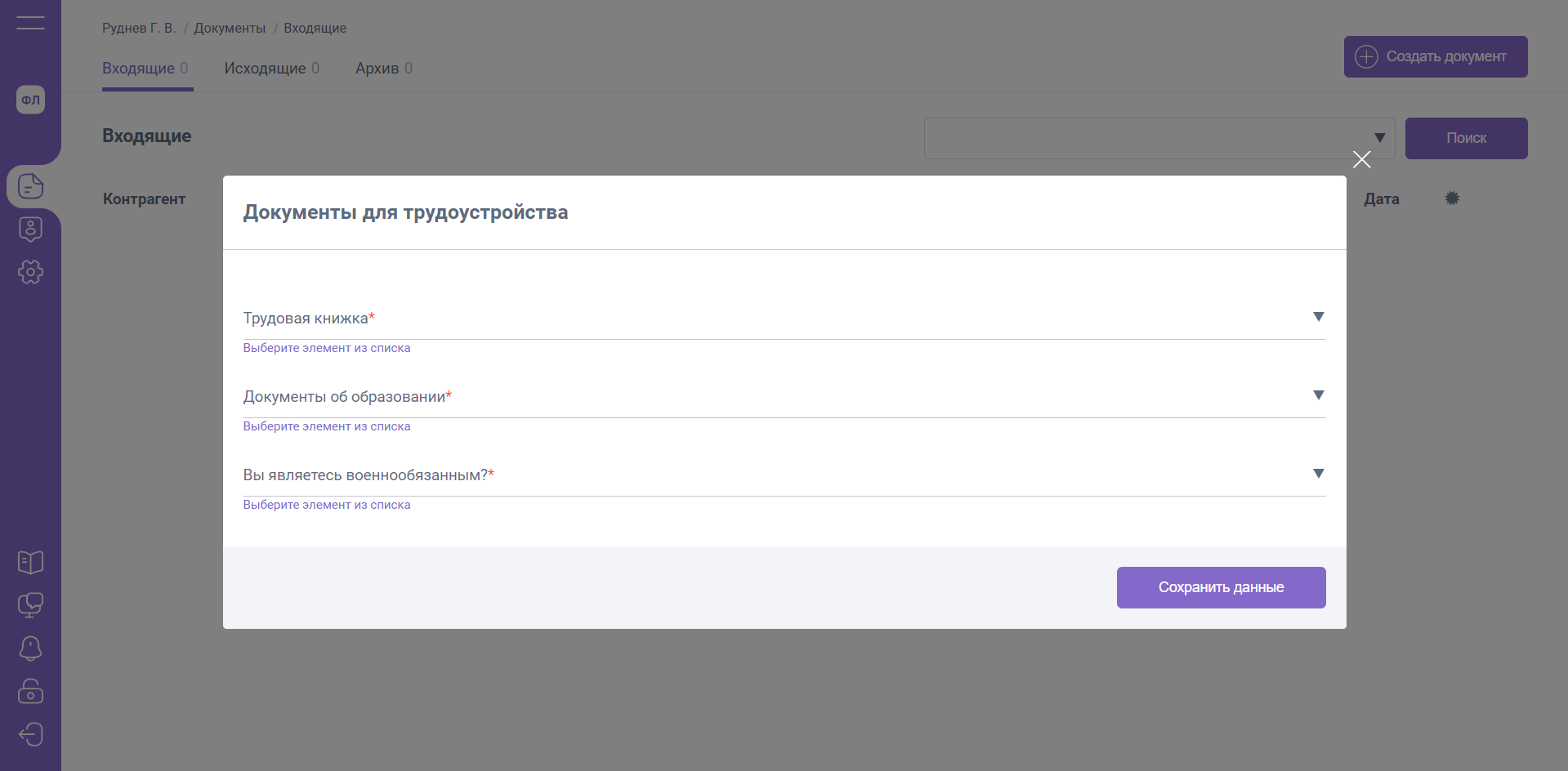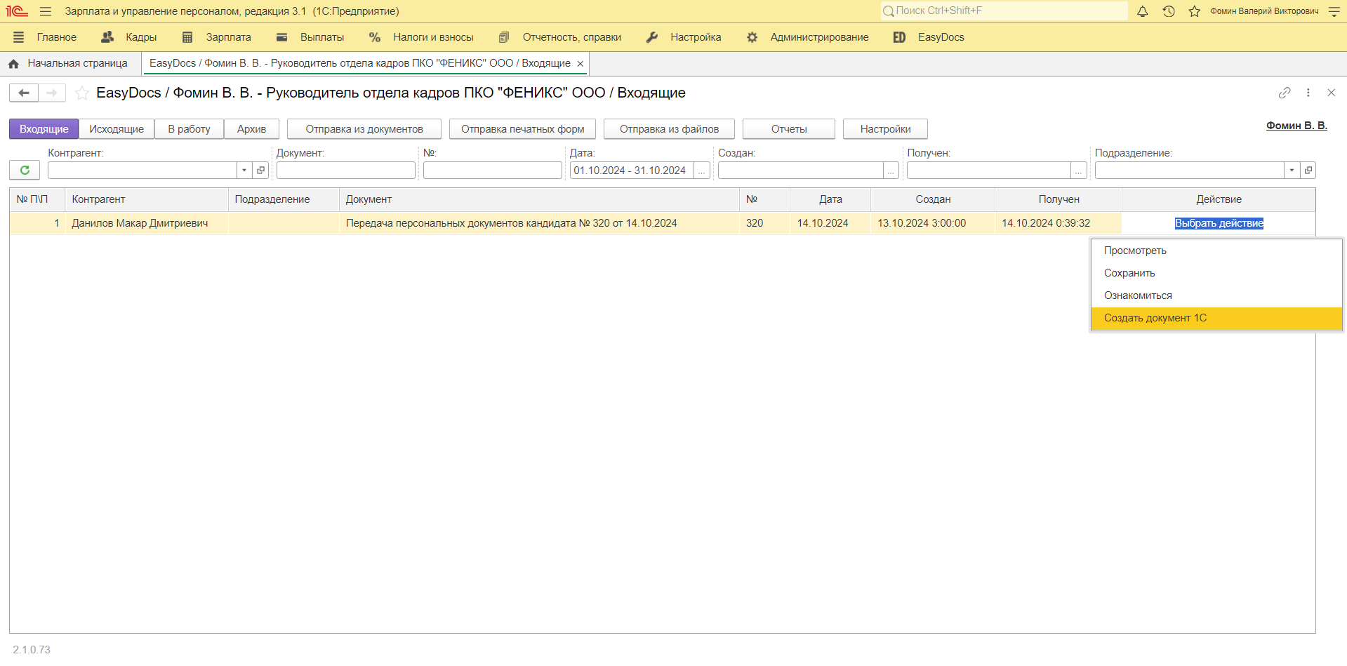 Со стороны кадрового специалиста (указанного при отправке анкеты кандидату) необходимо перейти в расширение EasyDocs и обработать поступившее сопроводительное письмо с данными кандидата.