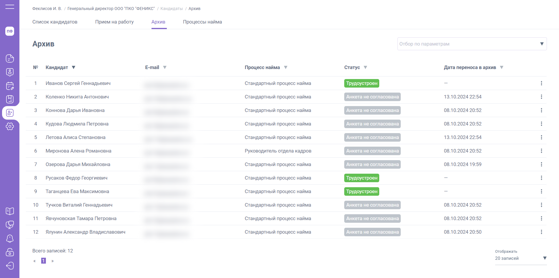 После проведения в 1С документа «Прием на работу», принятый на работу кандидат будет перемещен в архив со статусом «Трудоустроен».