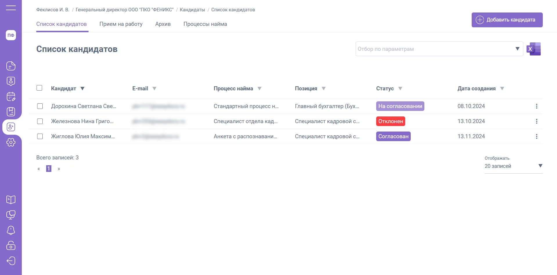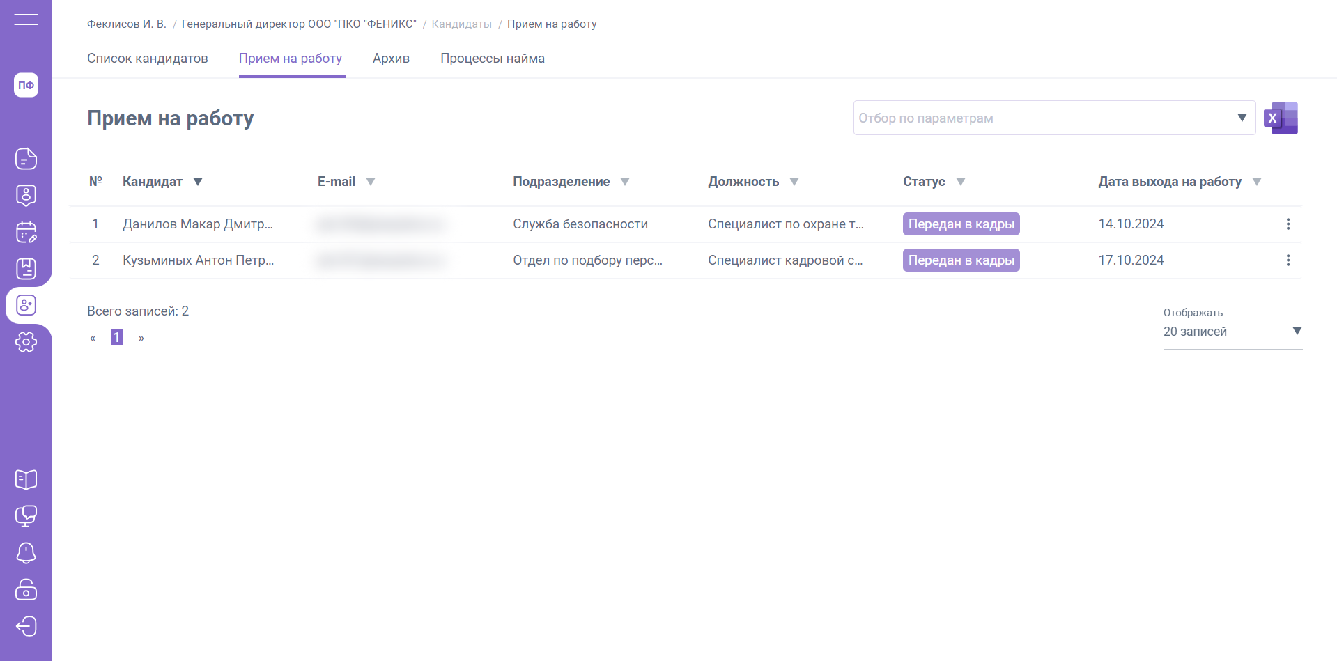 Как только кандидат пройдет регистрацию, в разделе «Кандидаты» / «Прием на работу» статус изменится на «Зарегистрирован».