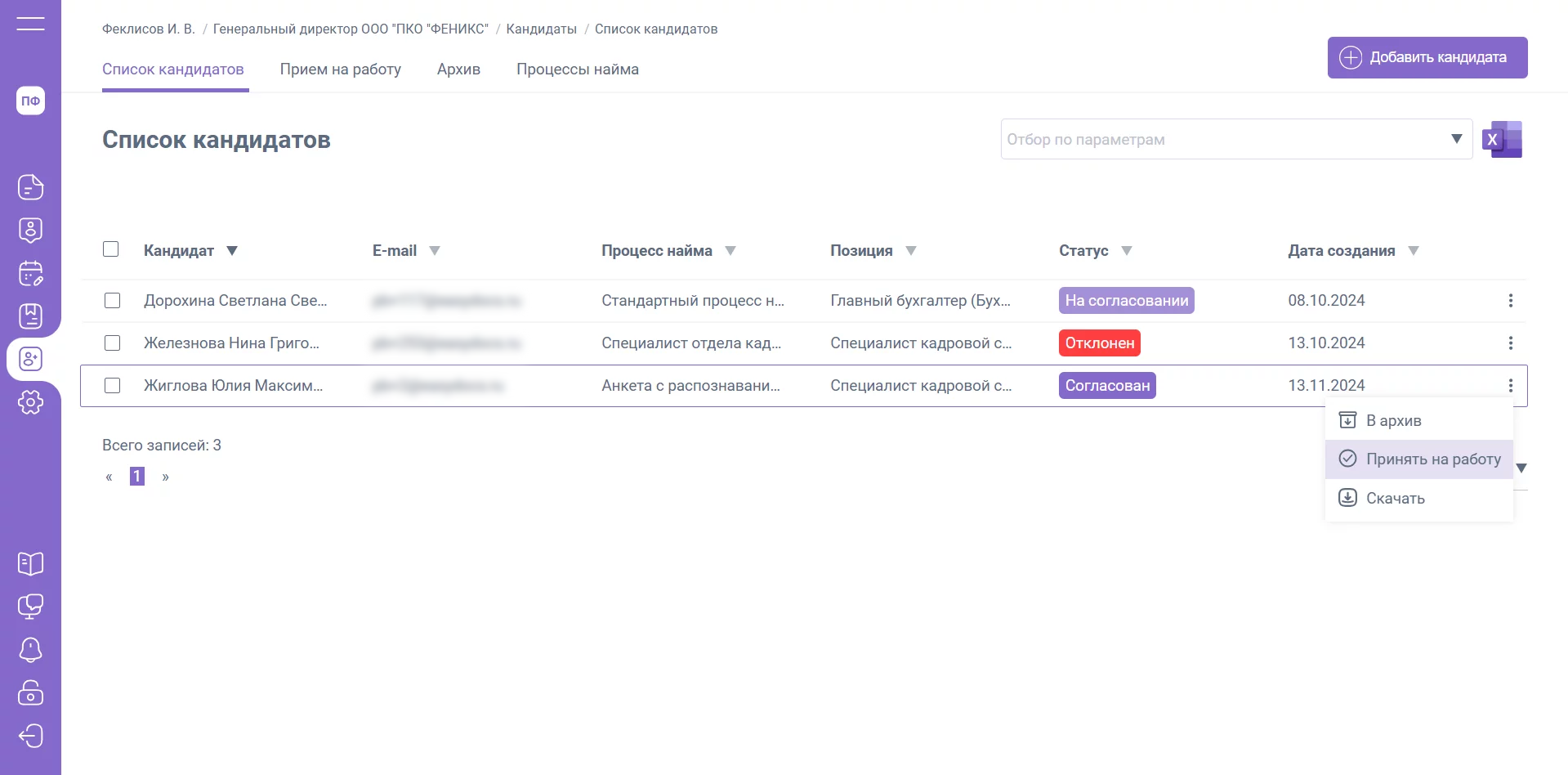 В том случае, если кандидат прошел все согласования, его статус меняется на «Согласован». У кандидата со статусом «Согласован» доступно меню с действиями: