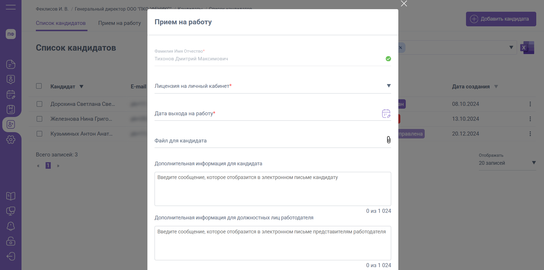 В разделе «Кандидаты» / «Прием на работу» отобразится кандидат, которому было отправлено приглашение.