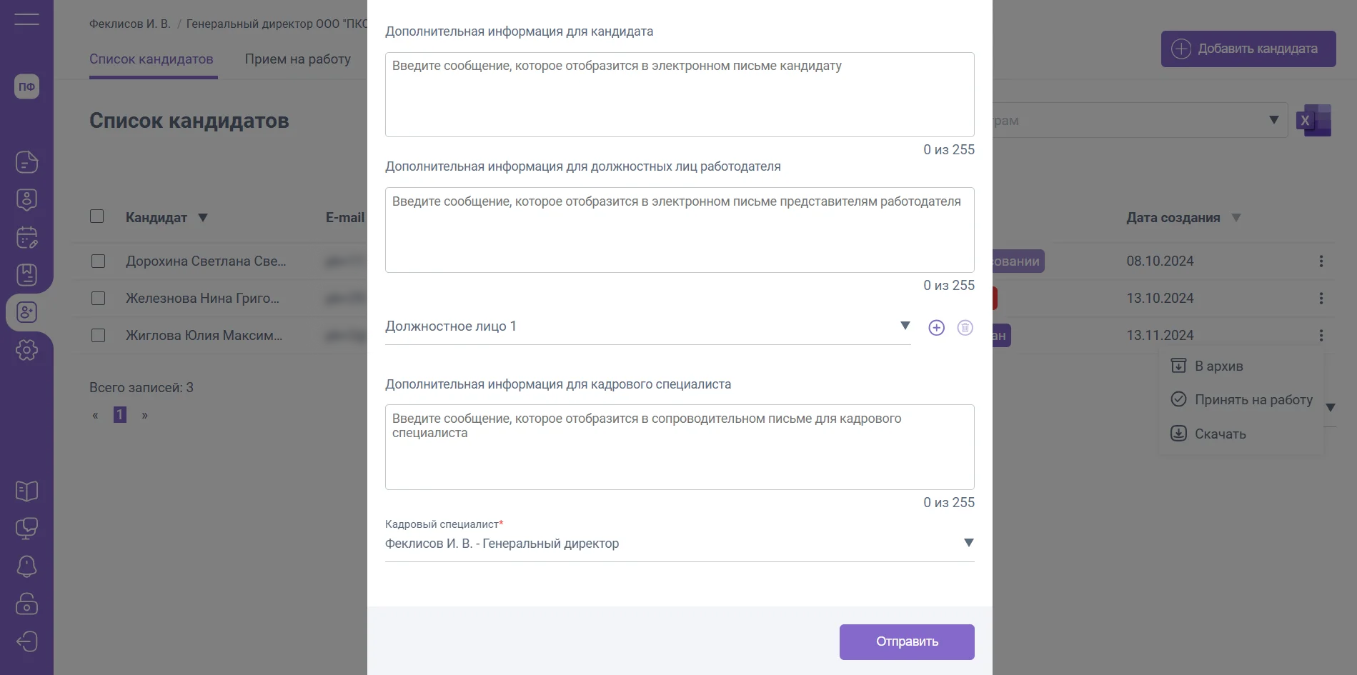 - В архив - кандидат будет перемещен в архив без дополнительных действий по его обработке