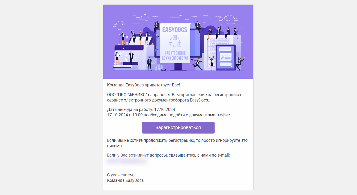 После нажатия на кнопку «Отправить» кандидату поступит письмо с приглашением на регистрацию в EasyDocs.