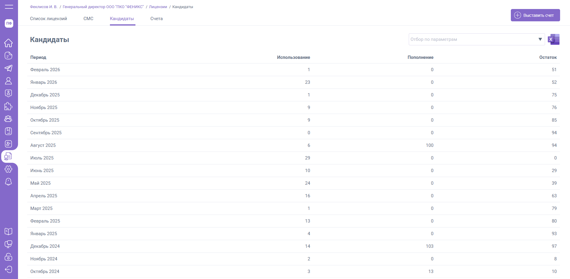- Пополнение – кол-во лицензий, пополненных при оплате счетов