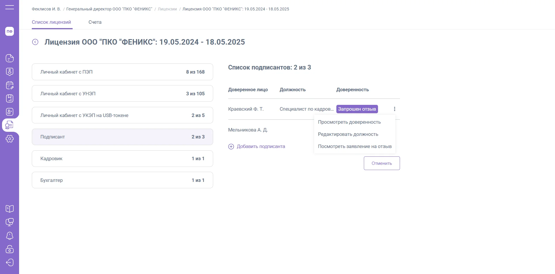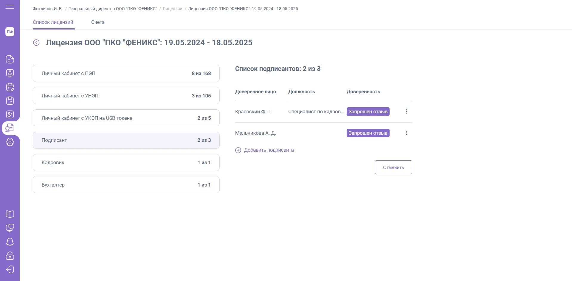 Добавление подписантов, выпуск машиночитаемых доверенностей и квалифицированных сертификатов электронной подписи для подписантов описаны в разделе руководства пользователя "Подписанты".