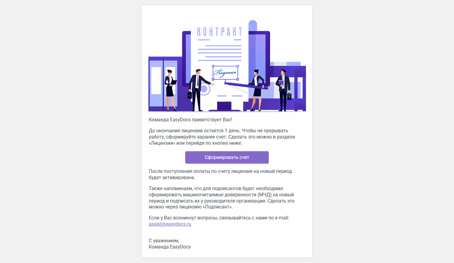 Если сформированный счет потребуется направить по ЭДО, обратитесь по адресу sales@easydocs.ru (в письме укажите номер счета и необходимость отправки по ЭДО).