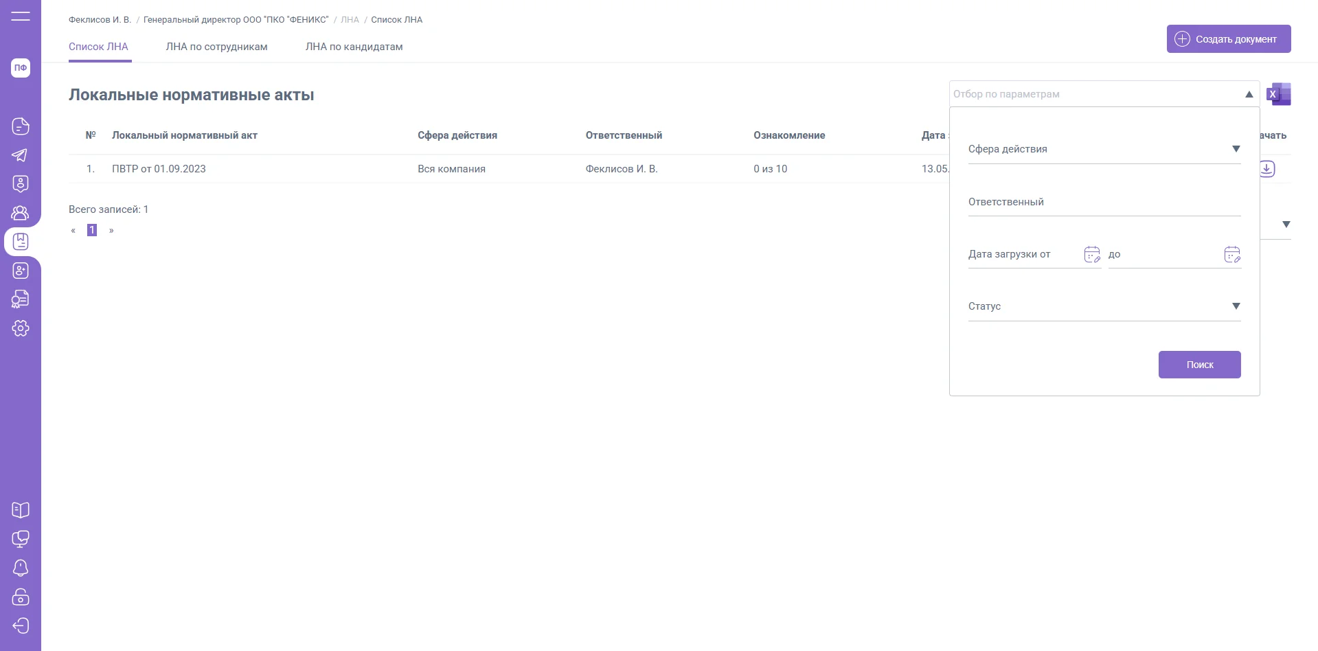 - Сфера действия – область применения ЛНА (Вся компания / Сотрудник / Подразделение / Должность)