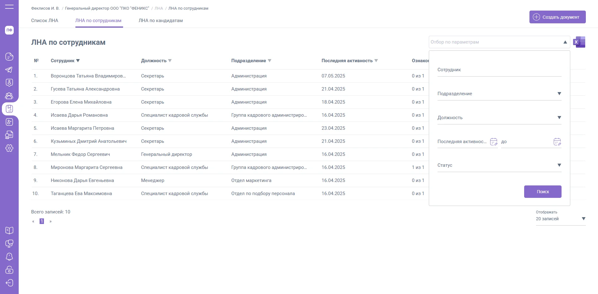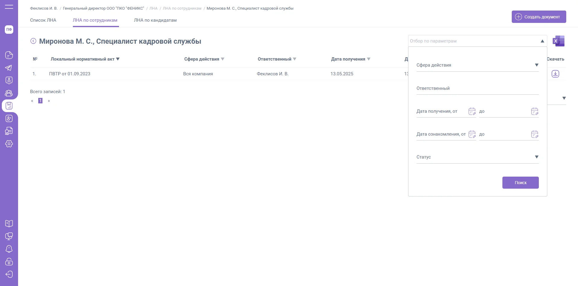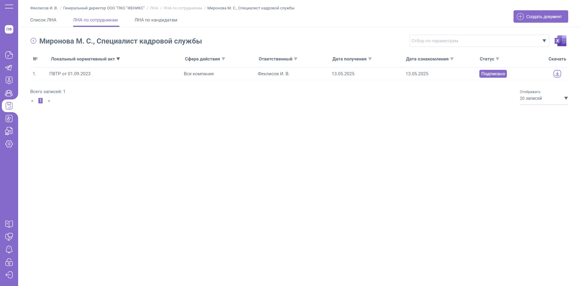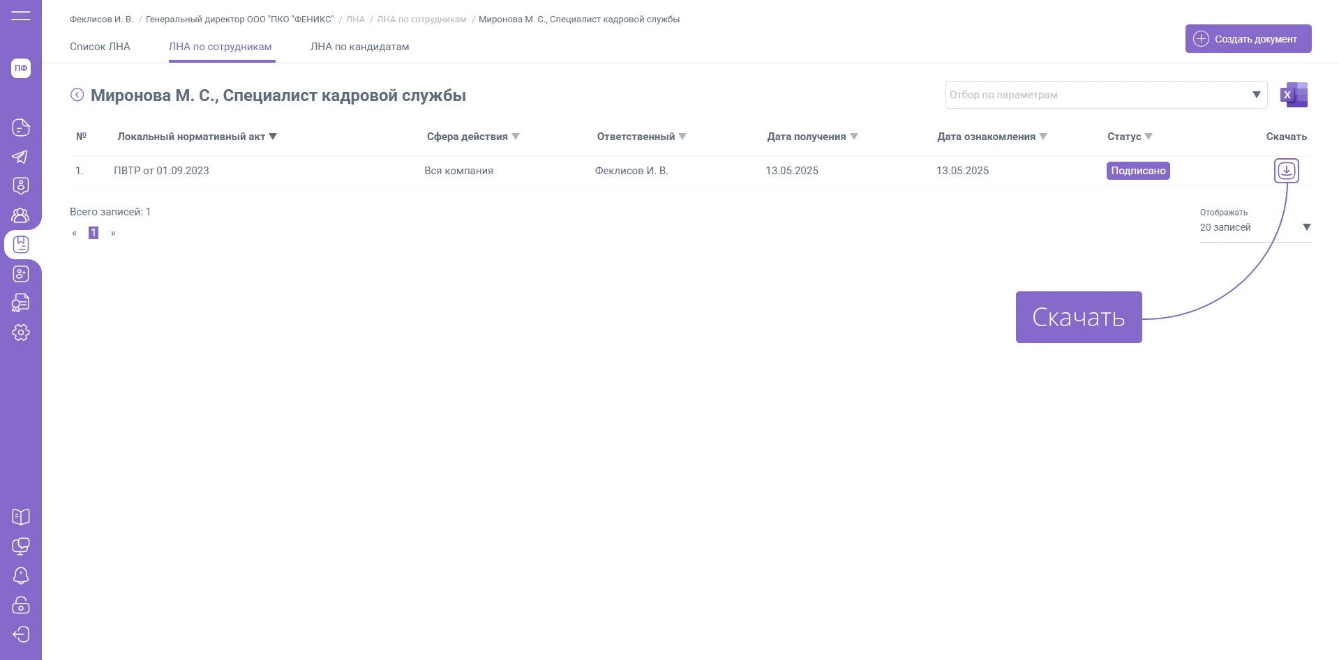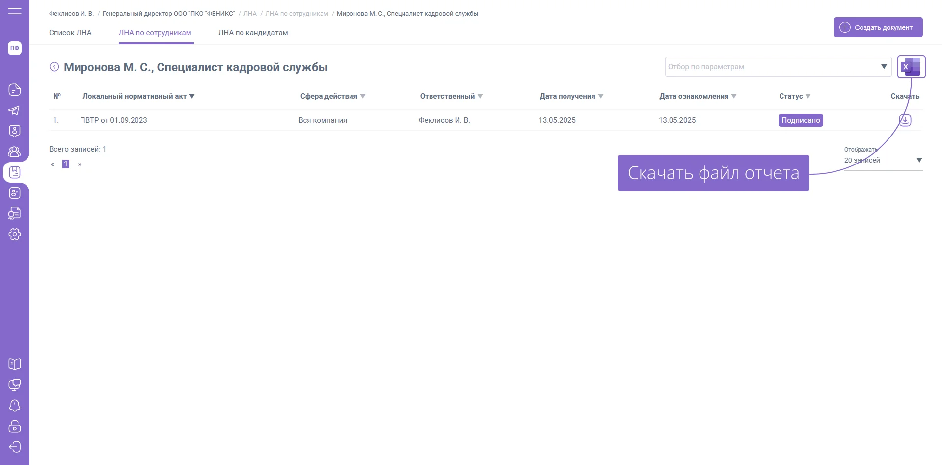 Вы также можете скачать полный отчет по статусам ознакомления сотрудника с ЛНА.