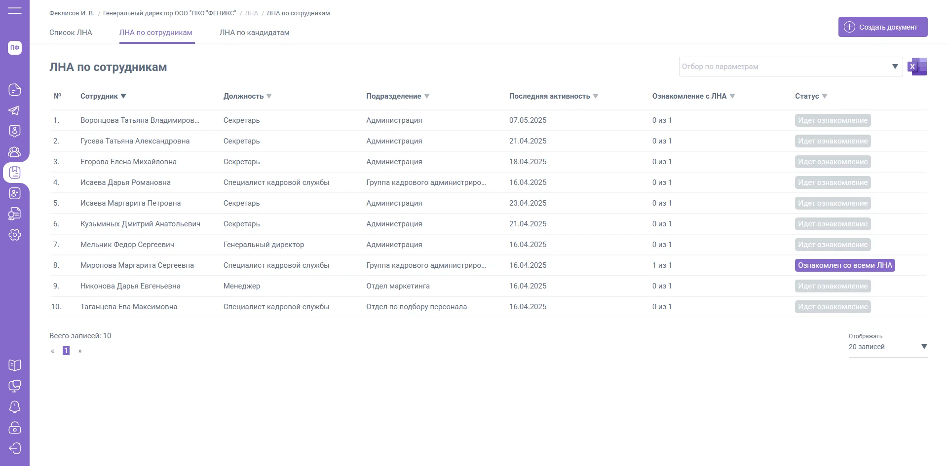 - Статус (Идет ознакомление / Ознакомлен со всеми ЛНА)
