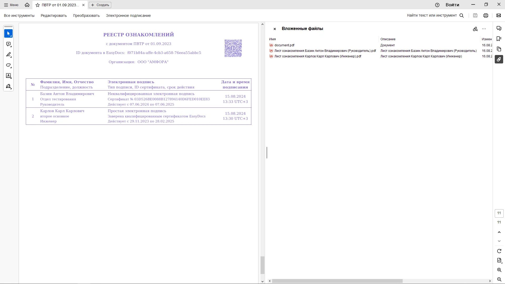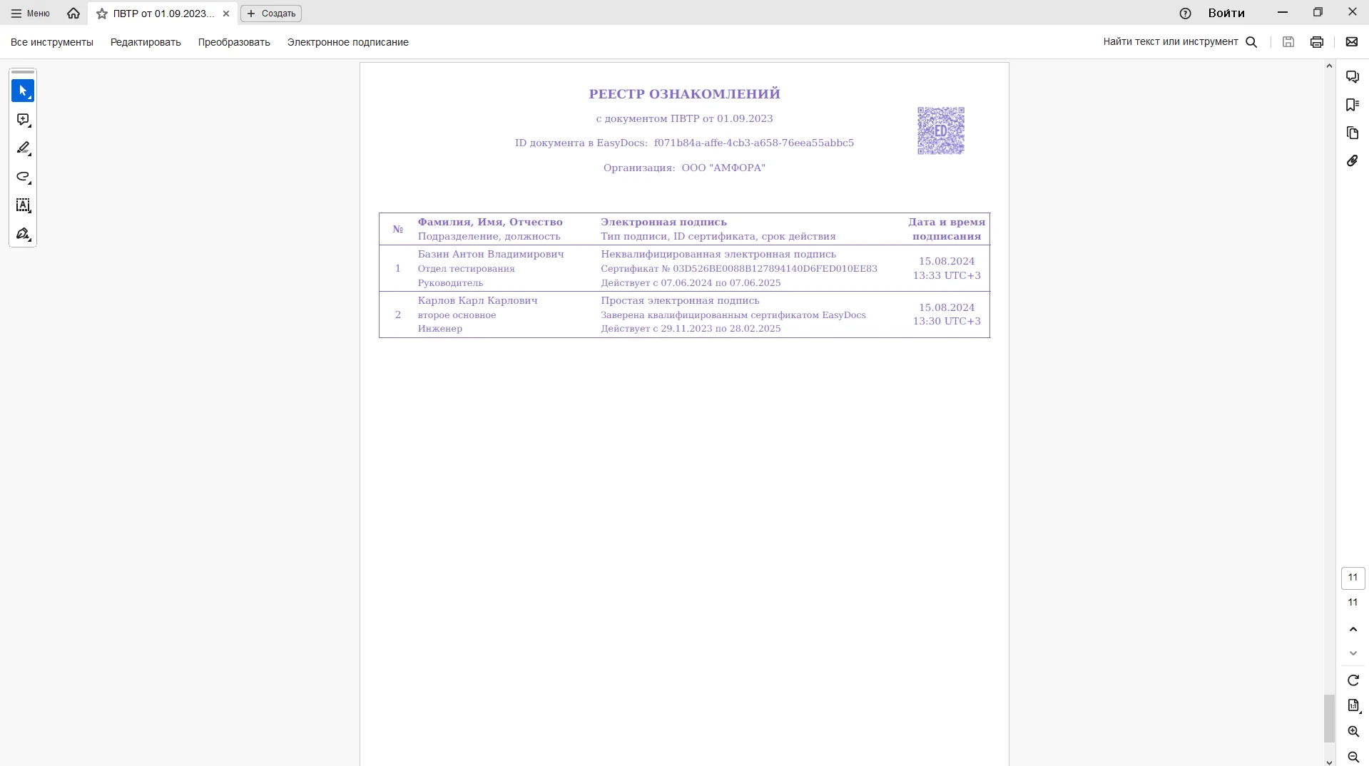 Реестр ознакомлений также содержит наименование документа, ID документа в EasyDocs, наименование организации. Наводя камеру телефона на qr – код (в правом верхнем углу листа) вы перейдете в созданный ЛНА внутри личного кабинета EasyDocs.