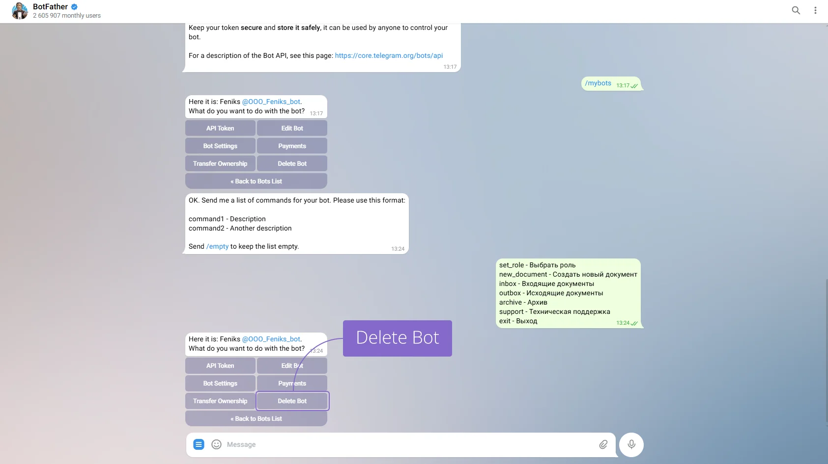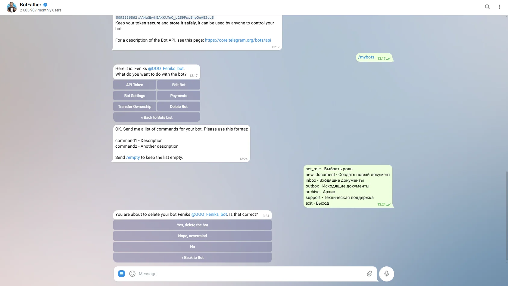 Если вам необходимо удалить созданного бота, перейдите в Telegram и выполните следующие действия: