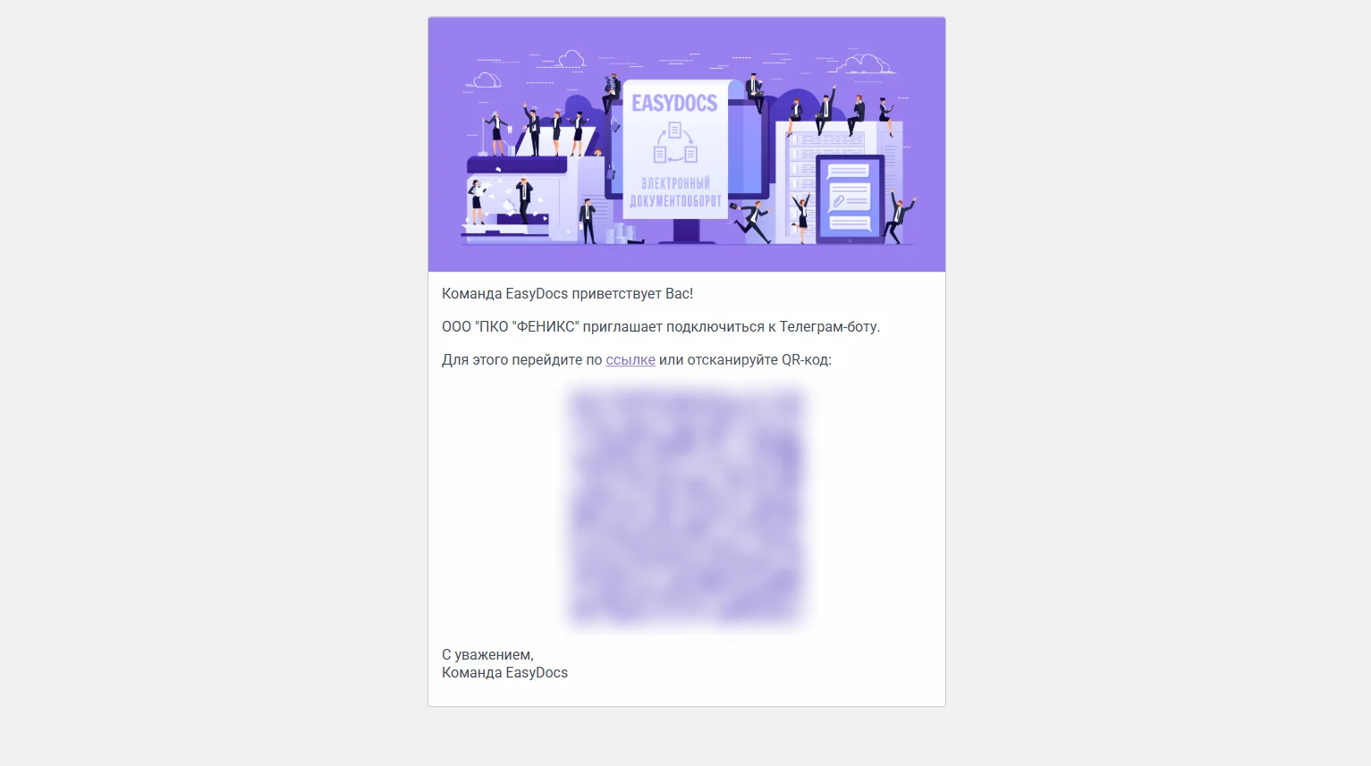 Вы можете отправить письмо – приглашение в сторону сотрудников и исполнителей, которые еще не подключены к Телеграм-боту вашего ИП / ЮЛ.