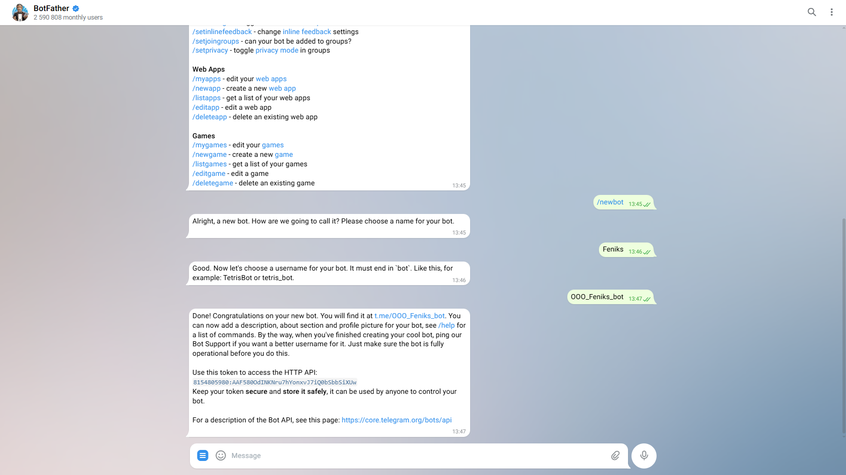 6. Укажите username – это уникальное имя, которое будет отображаться в ссылке на бота со значком @ (должно состоять исключительно из английских букв и цифр, а также включать в приставку «bot» в самом конце). Например, OOO_Feniks_bot