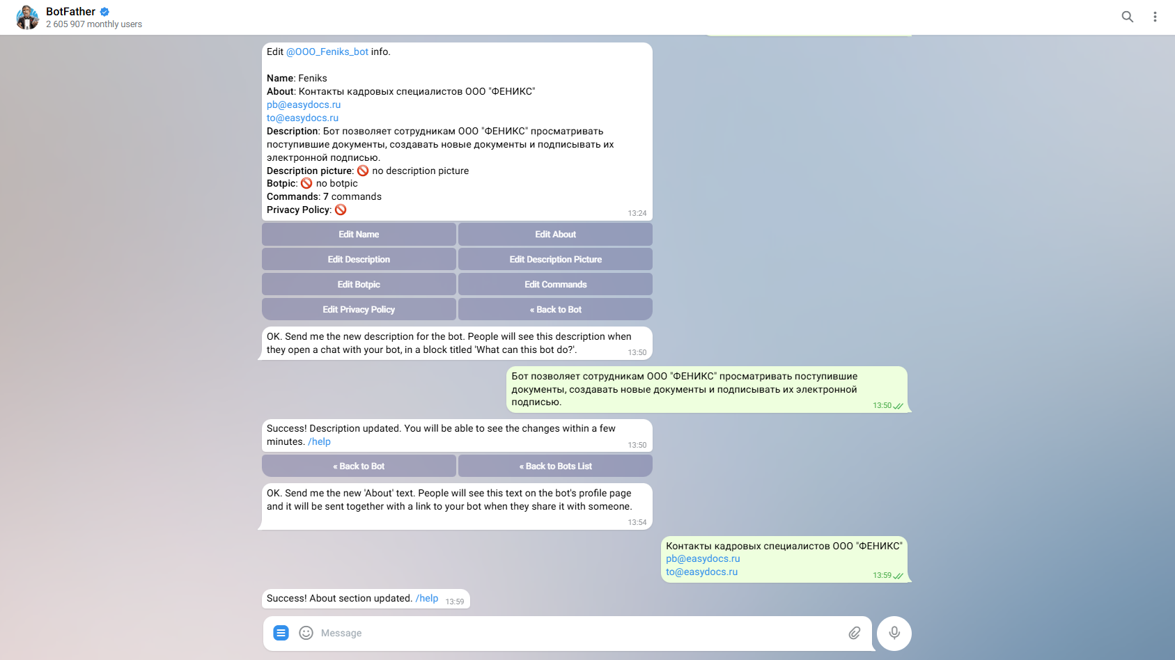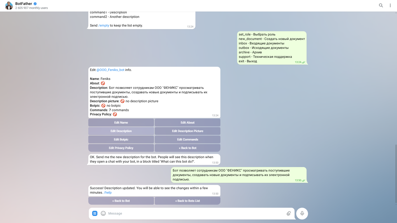 1. Edit Description – описание бота, которое будет доступно пользователю при начале работы с ботом