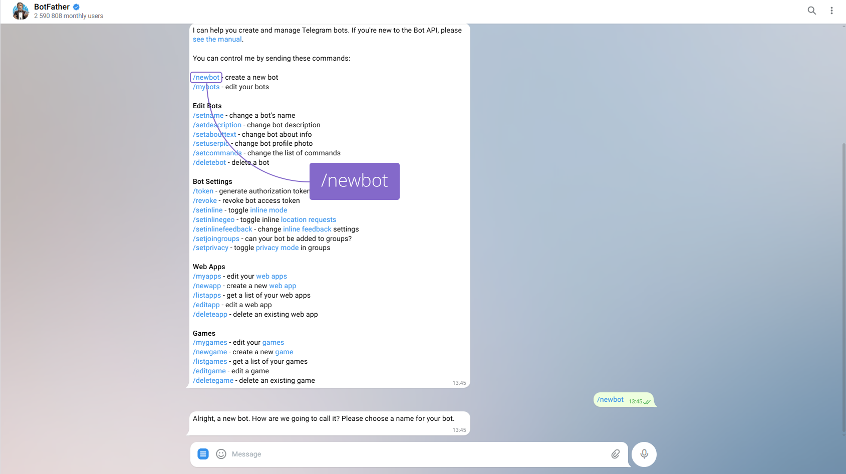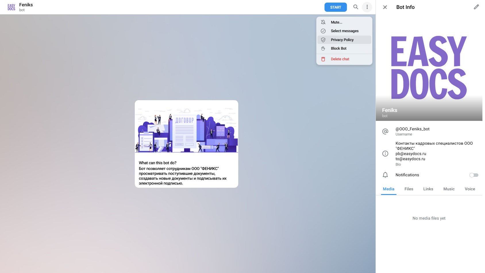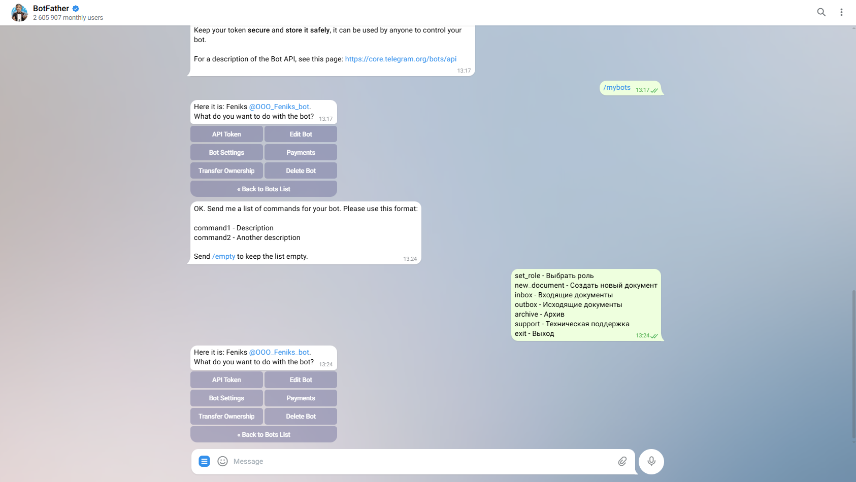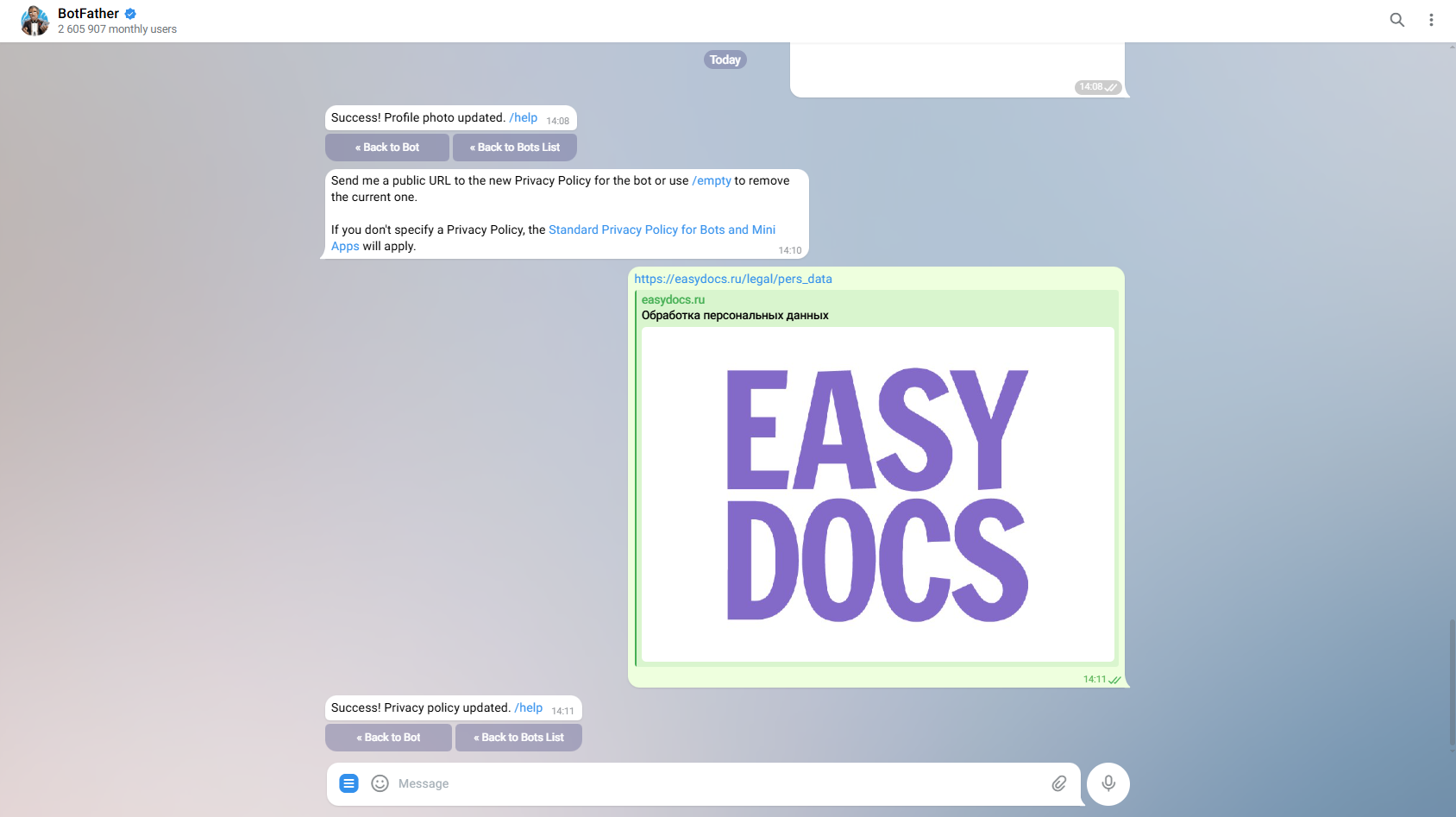 Чтобы пользователям было удобно работать с EasyDocs, необходимо добавить команды, которые будут отображаться в левом нижнем углу бота.