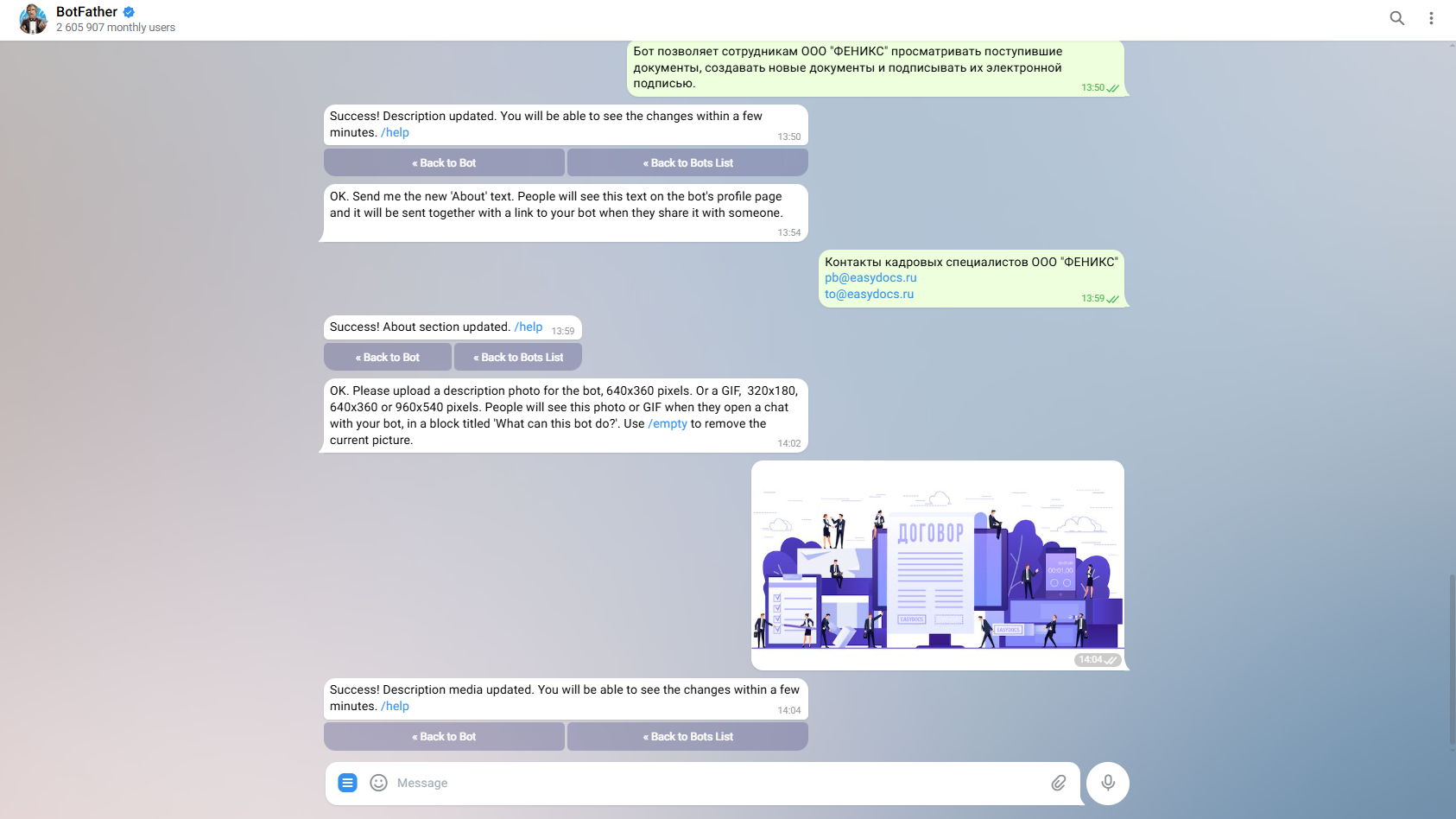 По кнопке «Back to Bots List» вы можете заполнить дополнительные сведения внутри созданного бота: