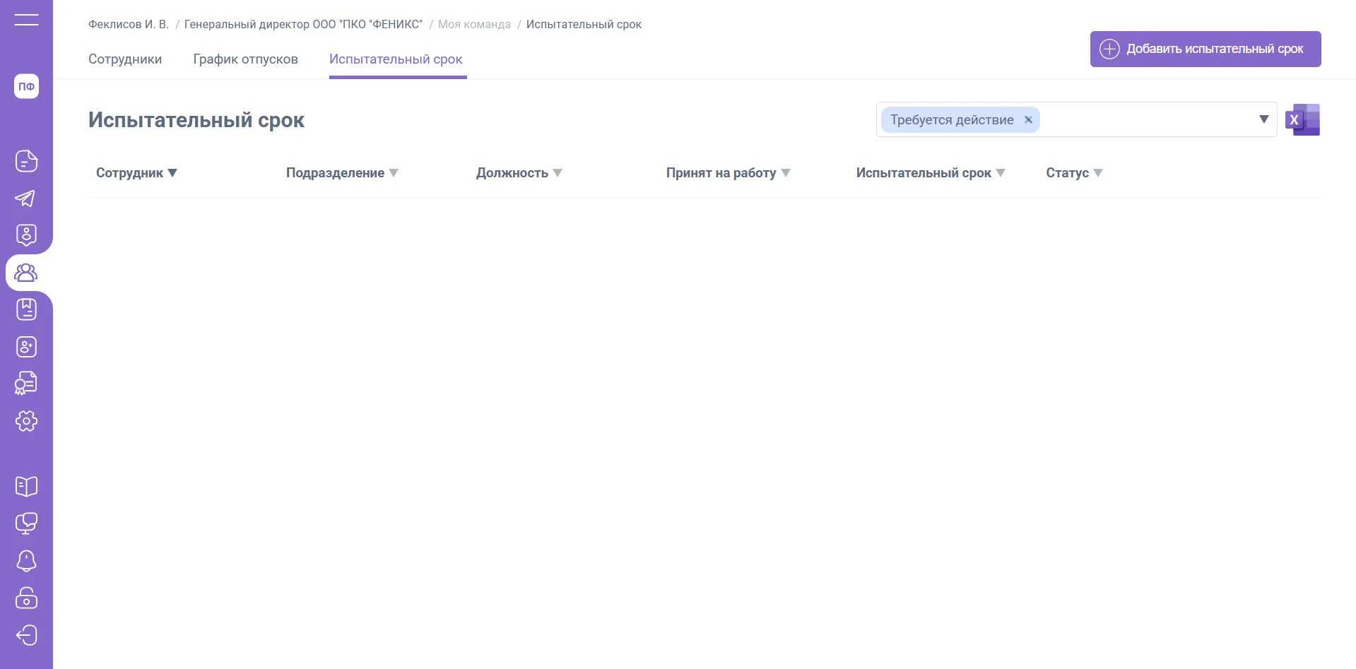Для добавления задач испытательного срока перейдите на вкладку «Испытательный срок» и нажмите «Добавить испытательный срок».