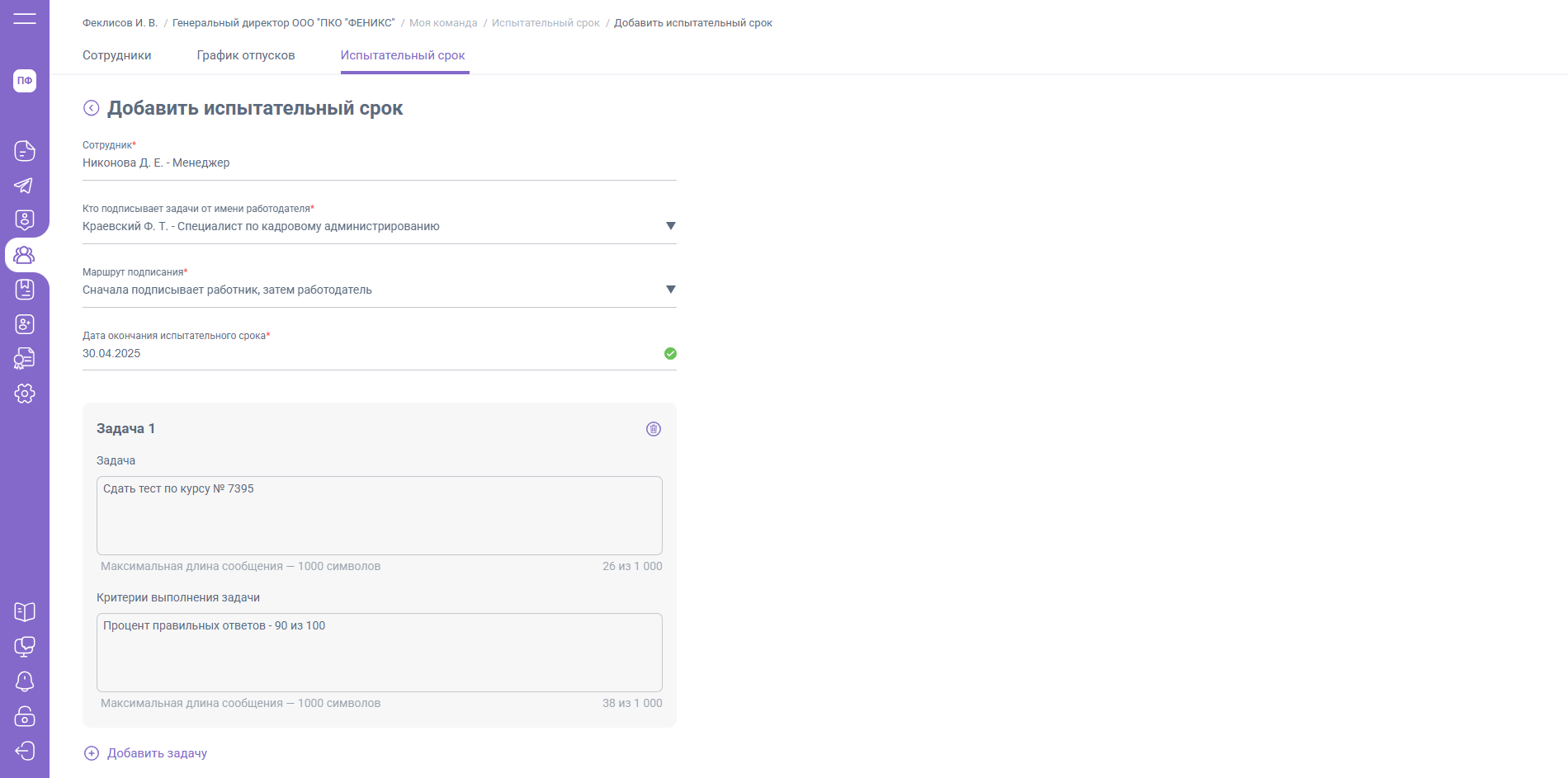 Если испытательный срок должен содержать более одной задачи, то нажмите «Добавить задачу». Для завершения создания испытательного срока нажмите «Создать».
