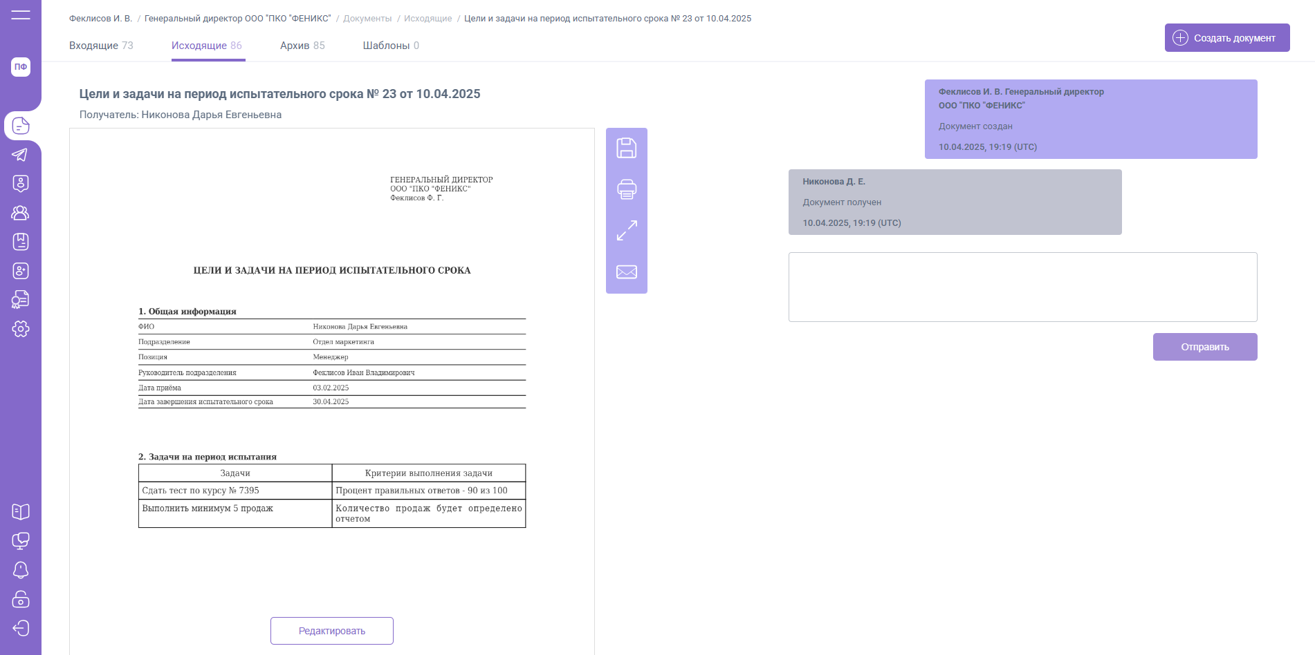 Документ «Цели и задачи на период испытательного срока» доступен в папке "Исходящие" у руководителя, создавшего испытательный срок. У выбранного подписанта документ доступен в папке «Входящие» или «Исходящие» (расположение документа зависит от маршрута, который был выбран при создании испытательного срока).