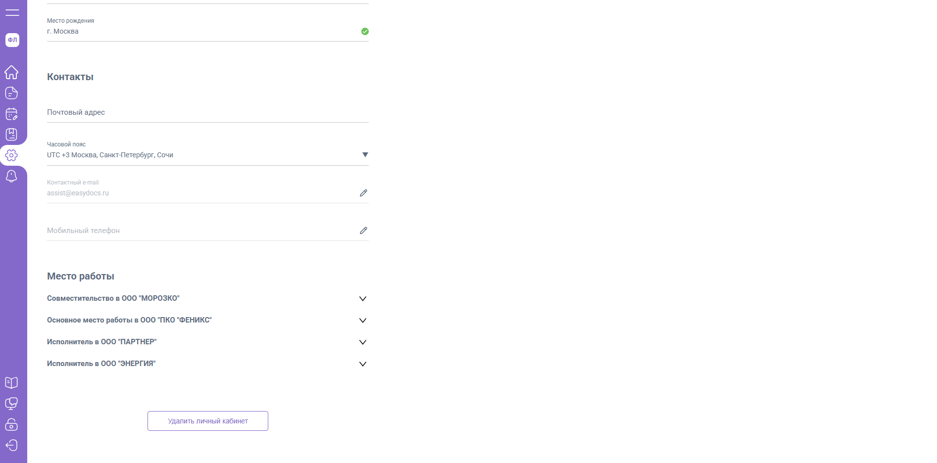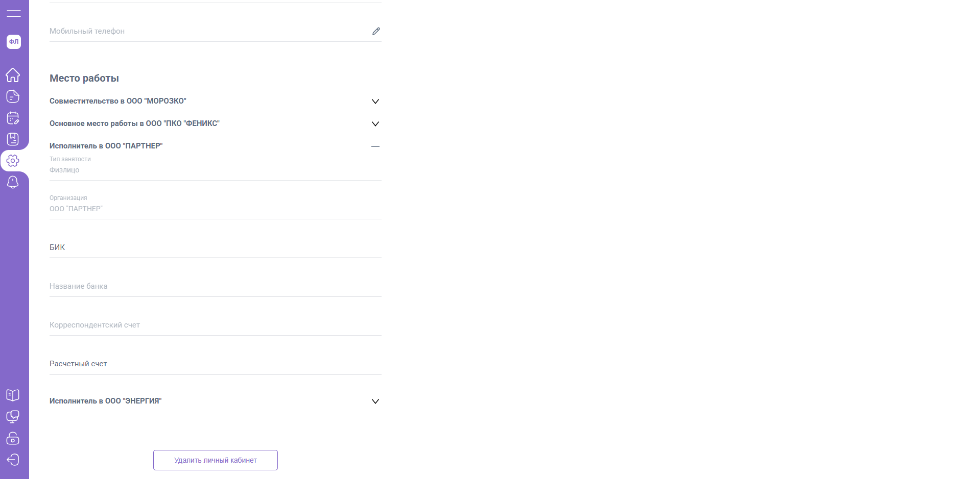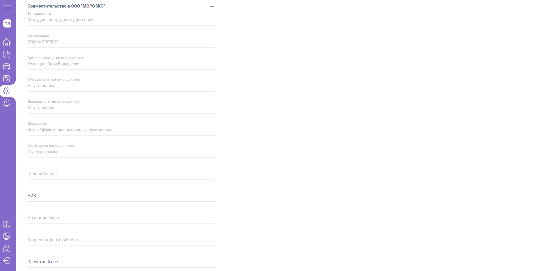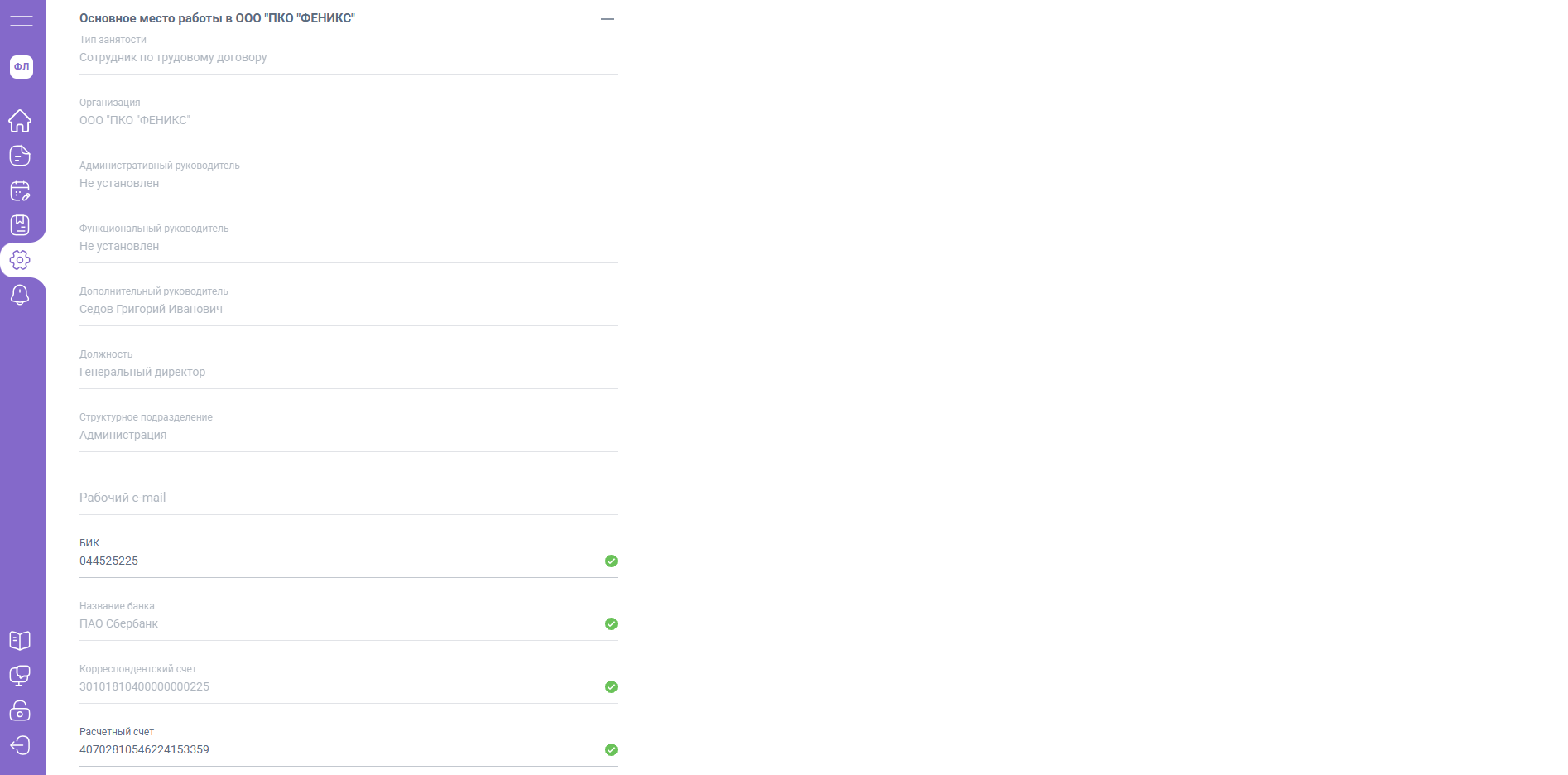 - Банковские реквизиты (БИК, название банка, корреспондетский счет, расчетный счет) - заполняются автоматически работодателем или вручную