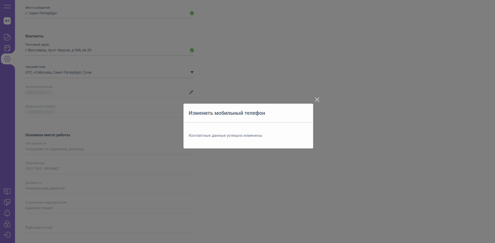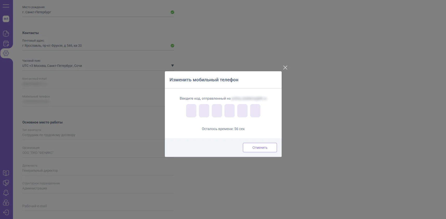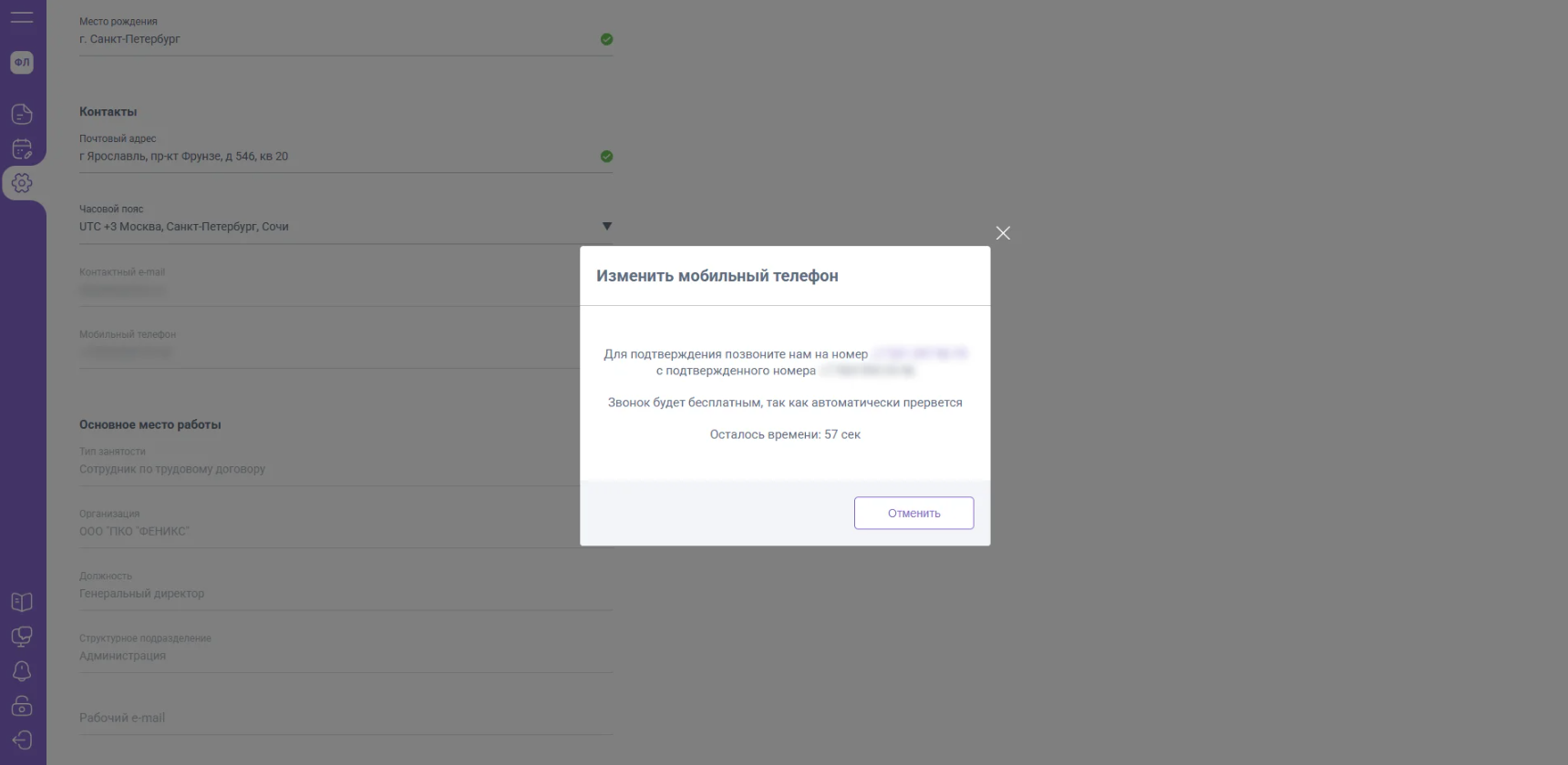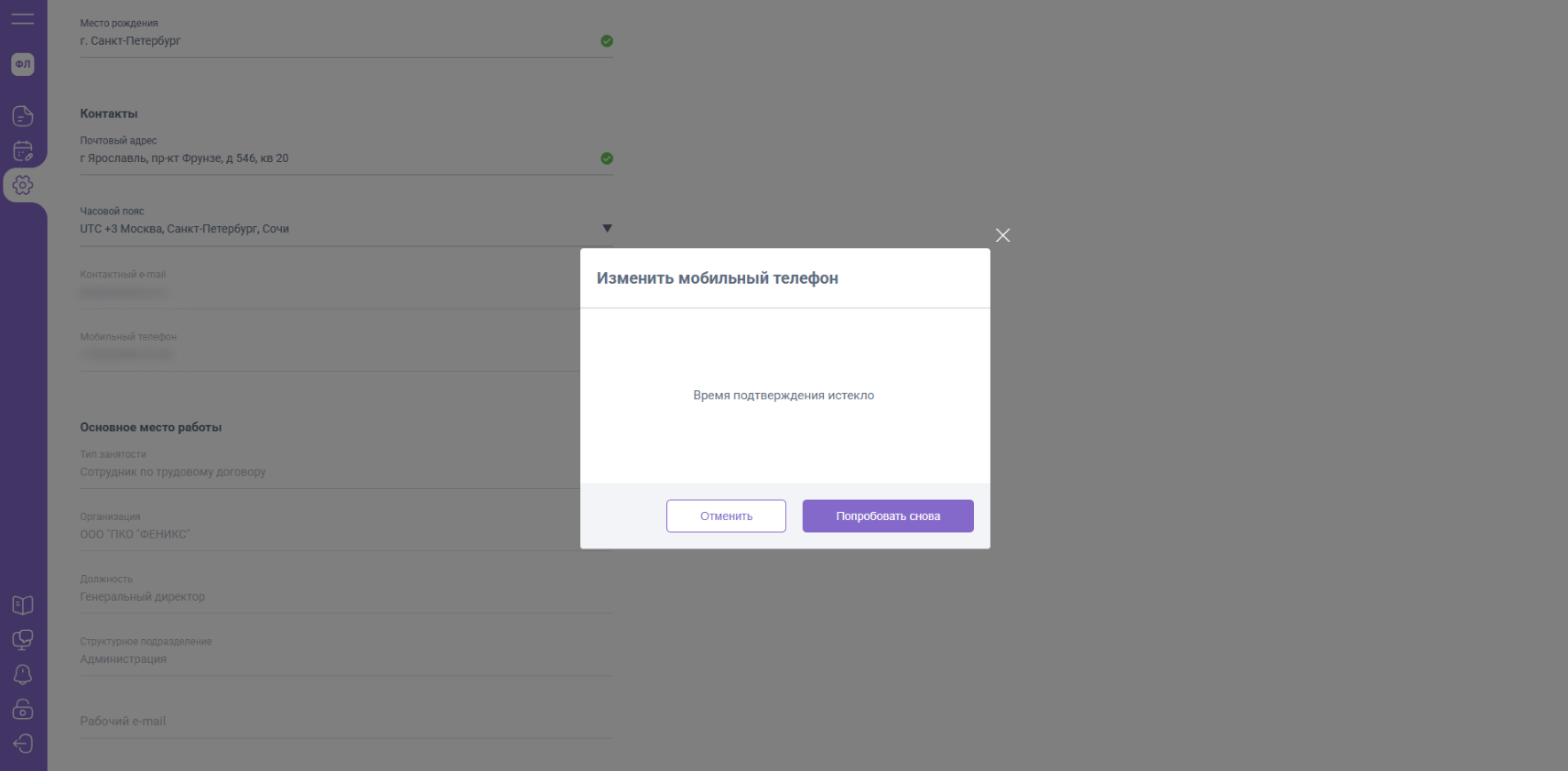 Если в течение отведенного на подтверждение изменений времени вы не успели ввести / получить код или позвонить по указанному номеру, то появится форма, на которой будет доступна возможность повторить процесс изменения контактных данных.