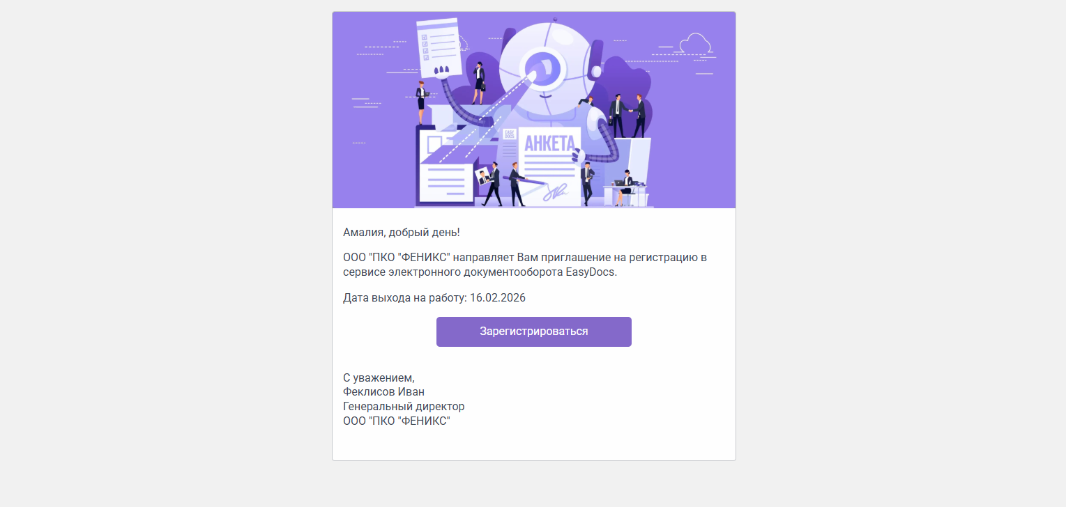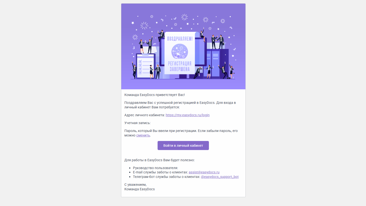 После ввода пароля регистрация завершена, на ваш email поступит письмо "Регистрация в EasyDocs".