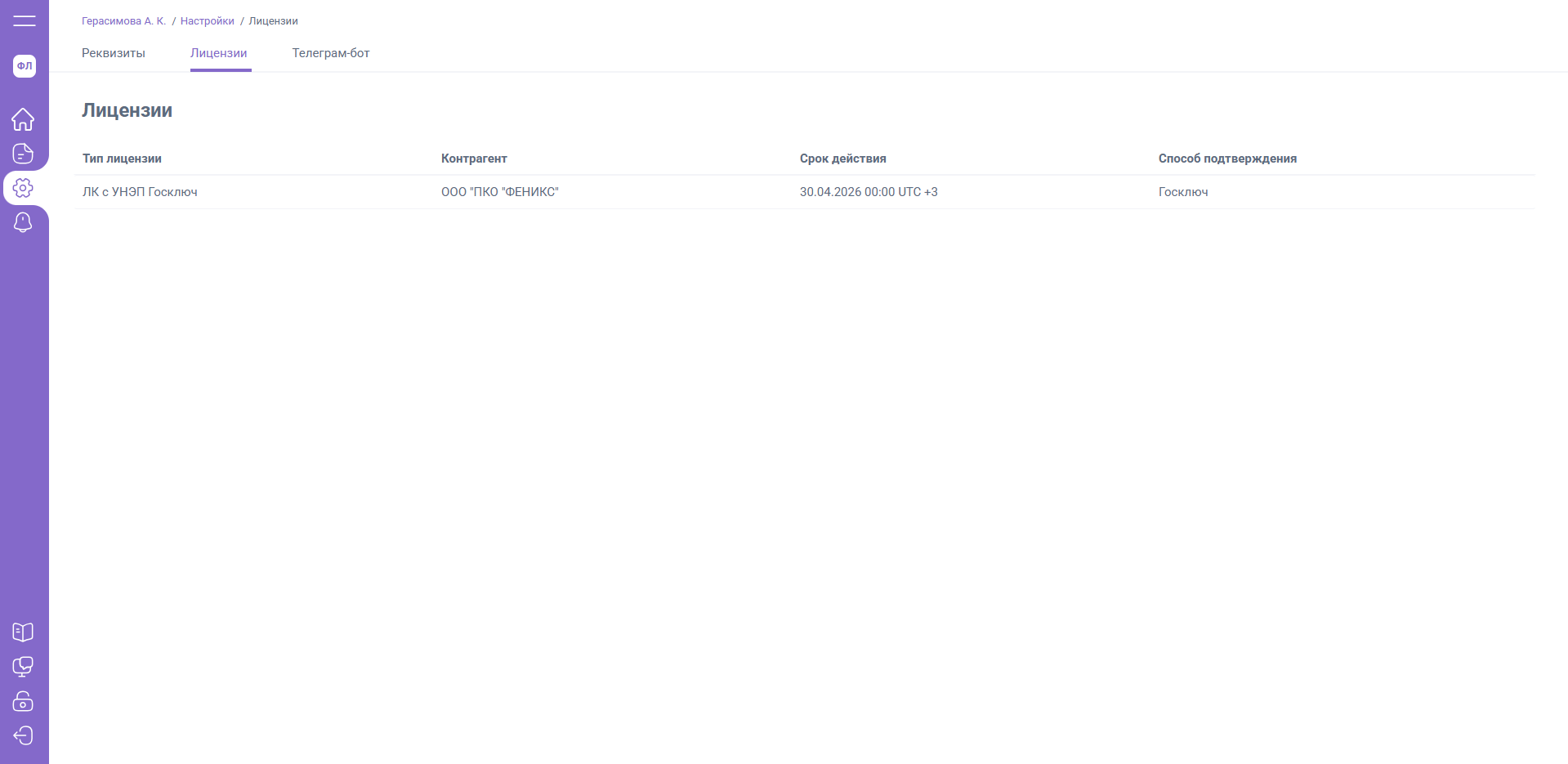 В разделе "Настройки" / "Лицензии" вы можете проверить тип лицензии, установленной контрагентом (ЮЛ / ИП):