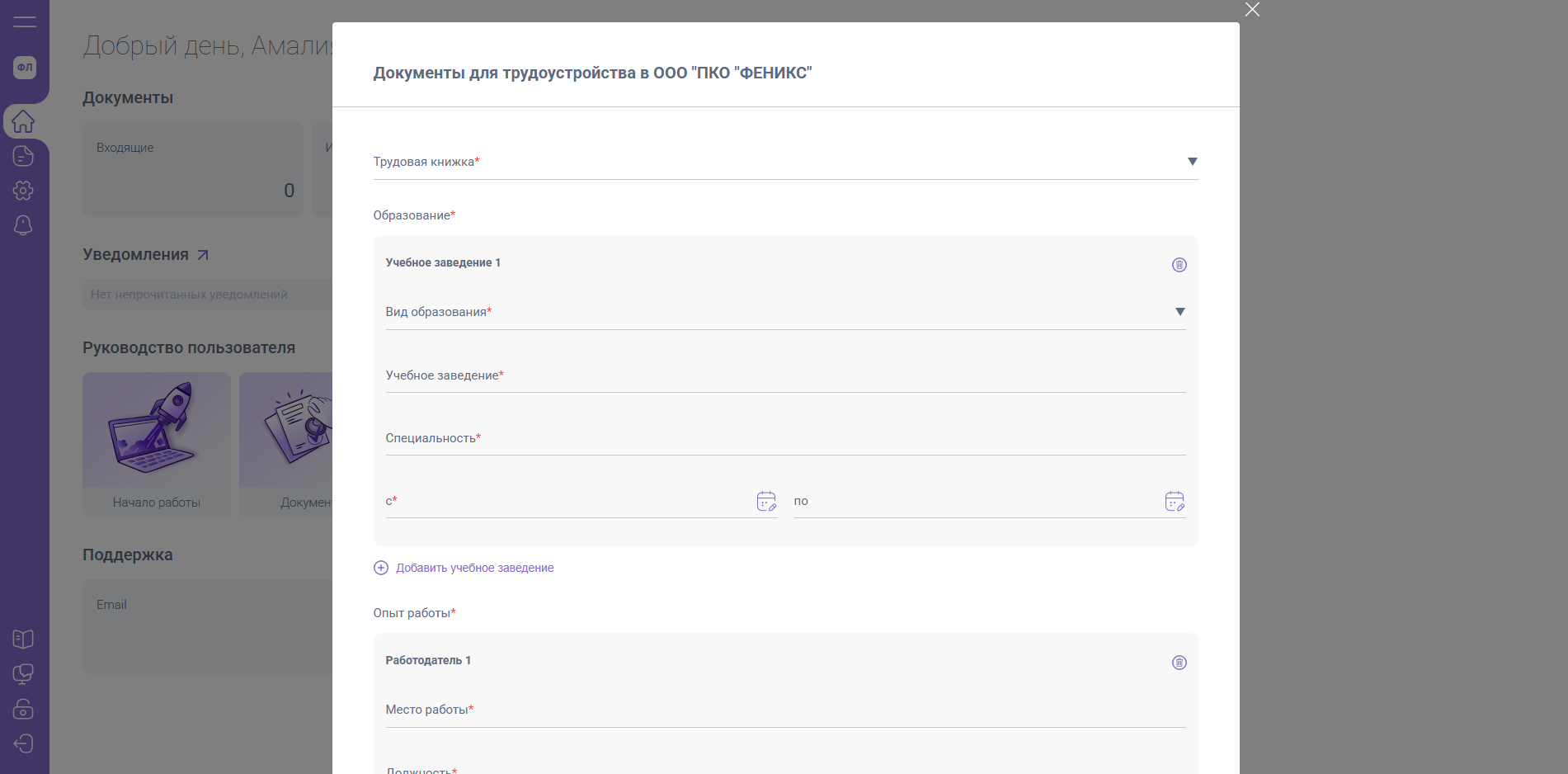 После принятия условий оферты будет открыта форма заполнения этапа "Трудоустройство", где потребуется заполнить данные, запрашиваемые со стороны ЮЛ / ИП, направившего приглашение.